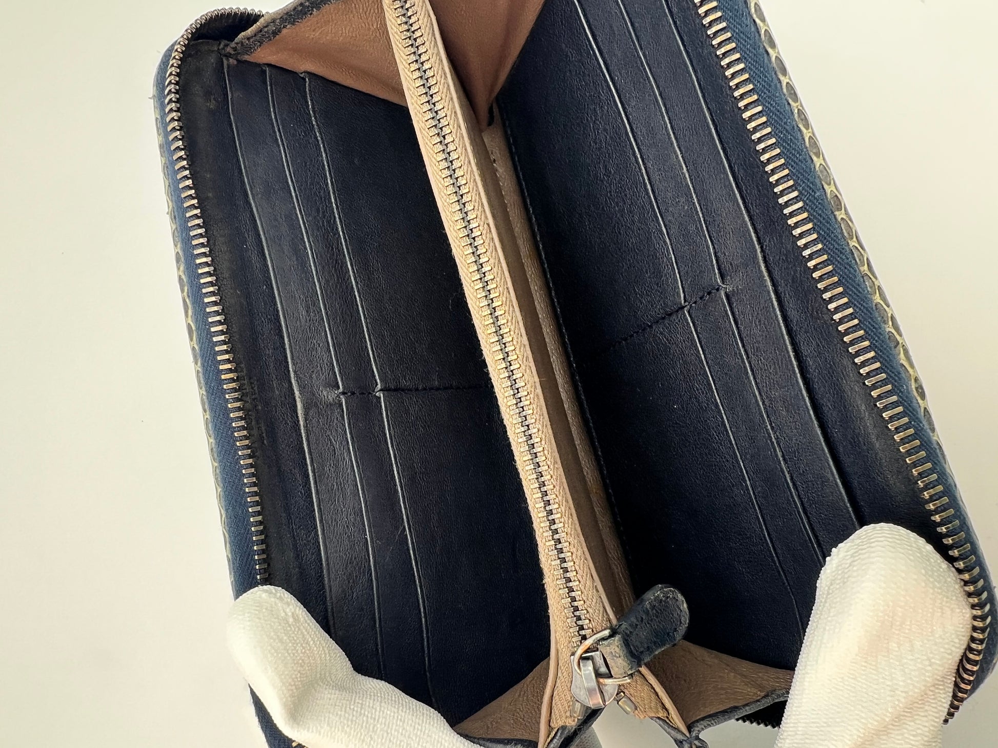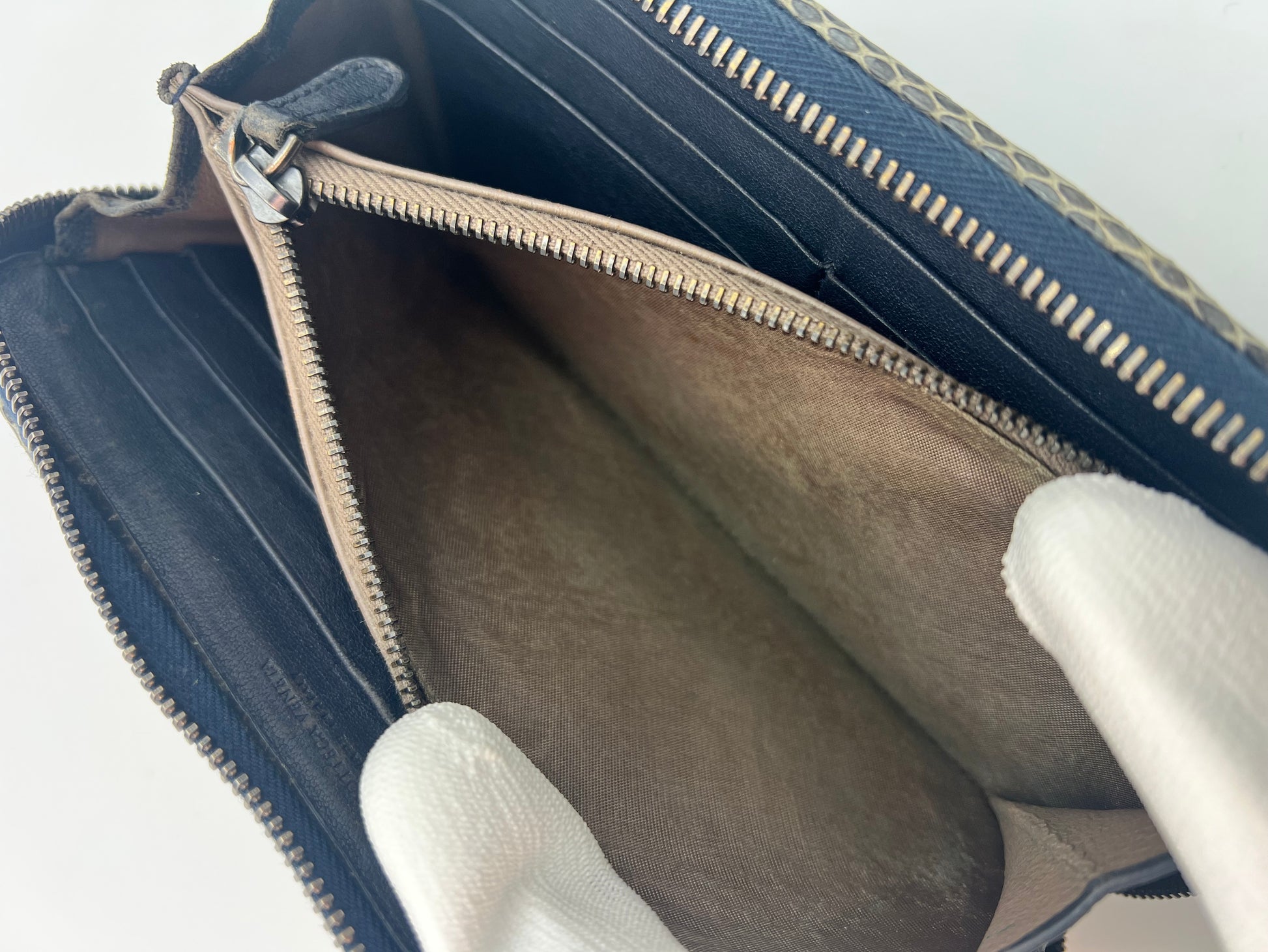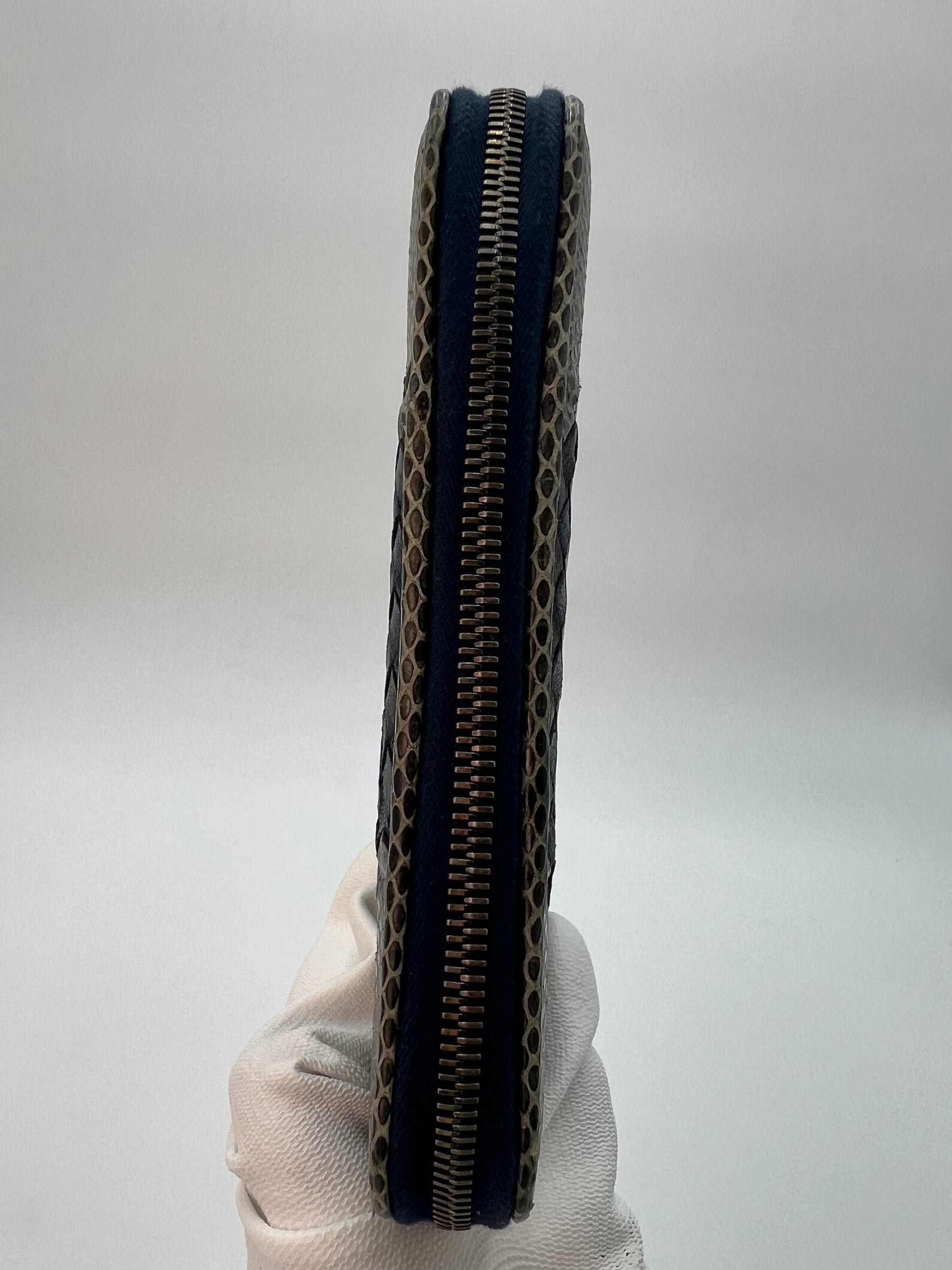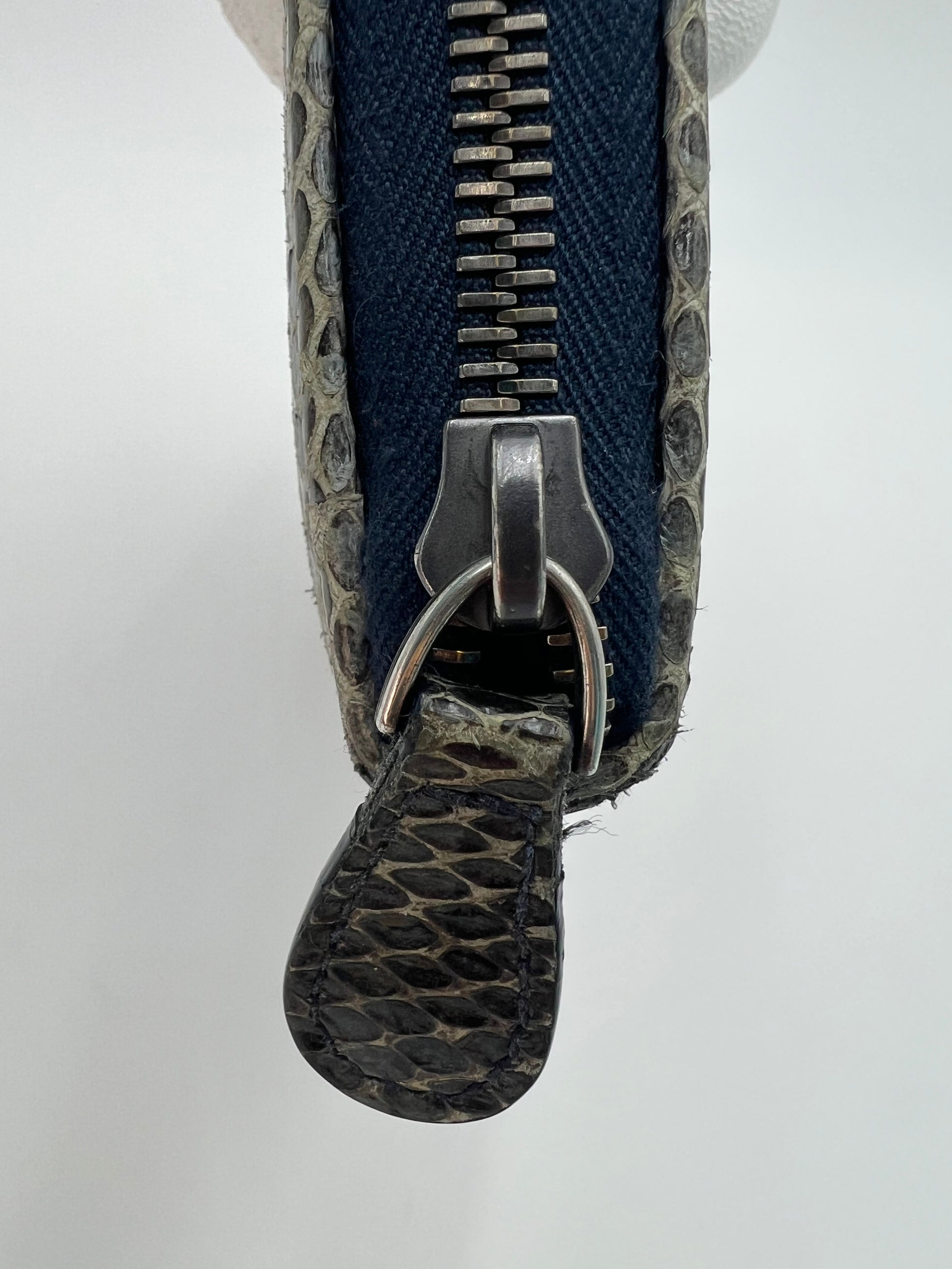Signs of use throughout, no flaws to note. Wear to edges and zipper pulls. Clean interior. Navy leather and snake skin.