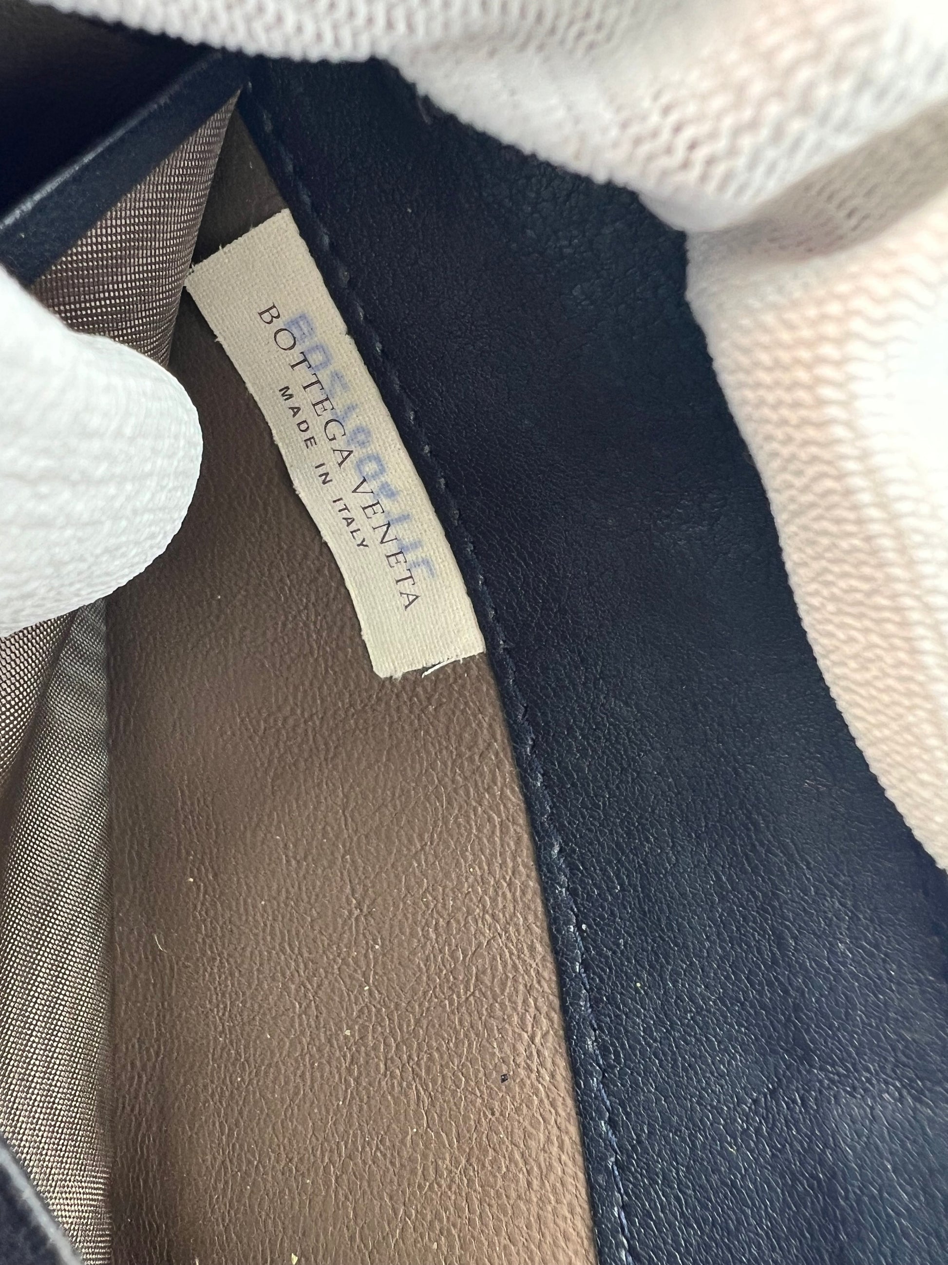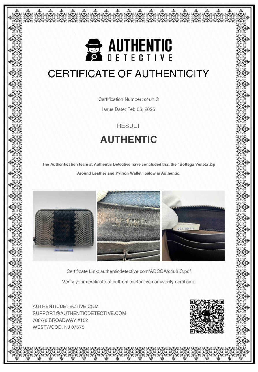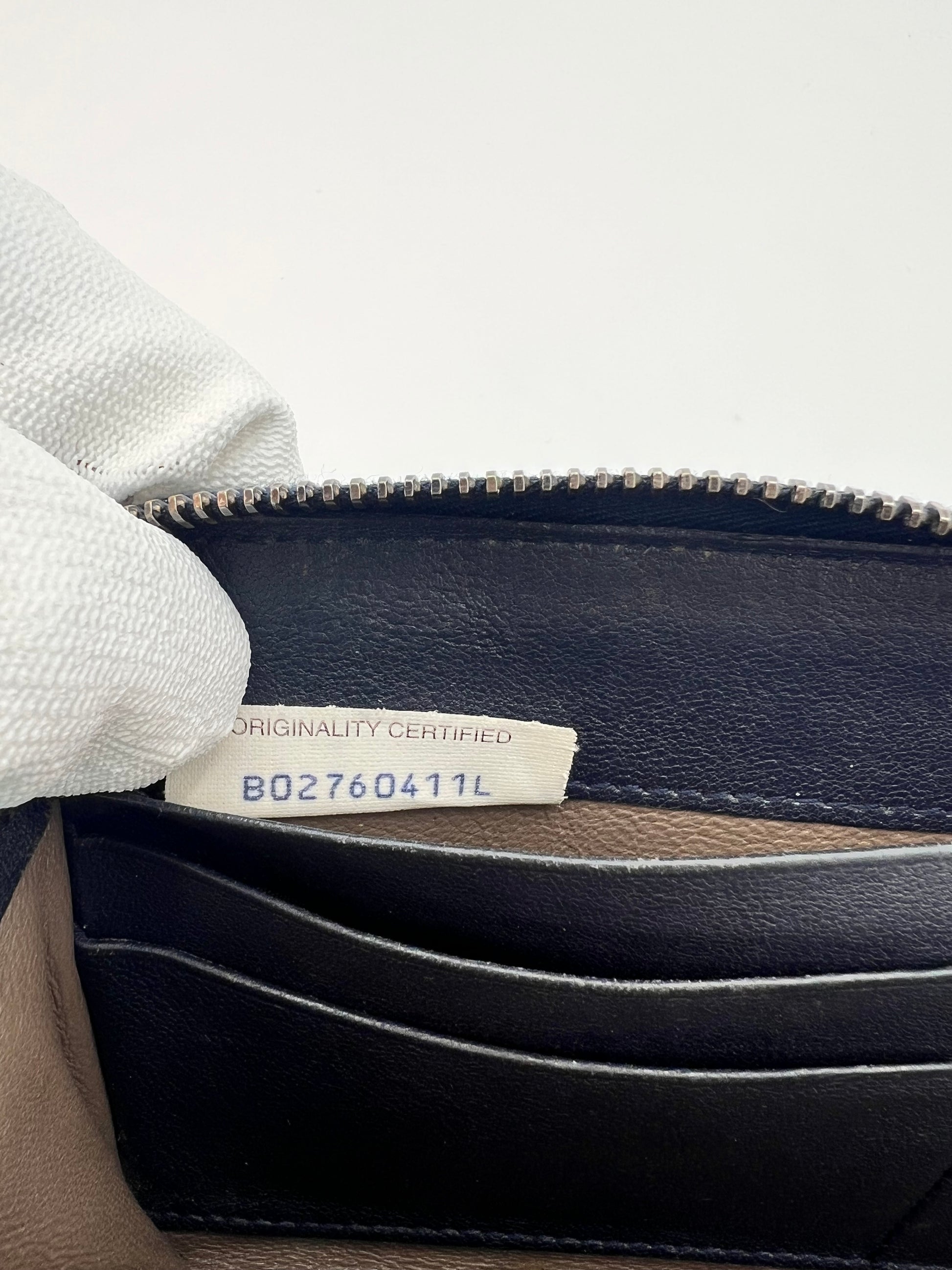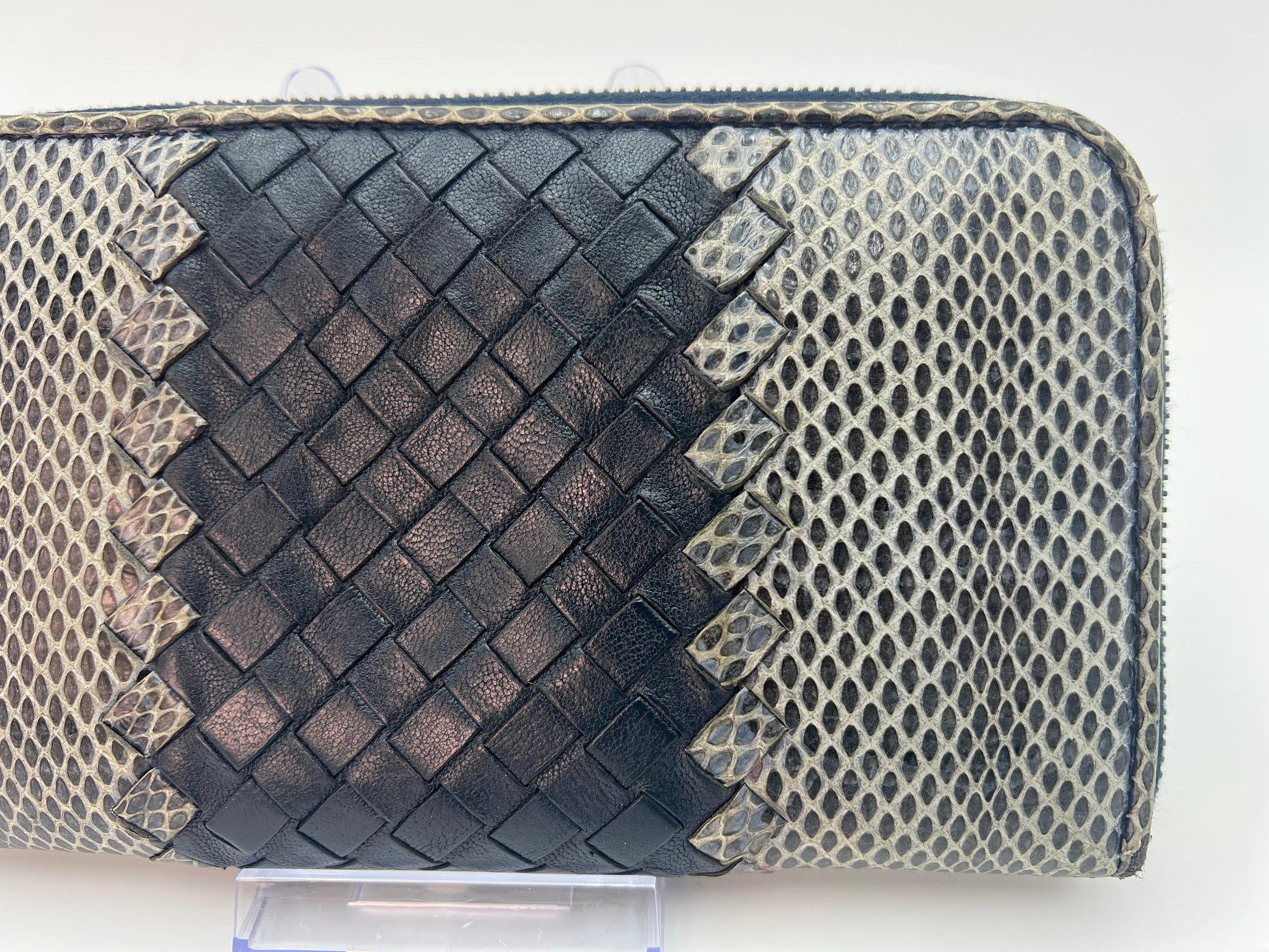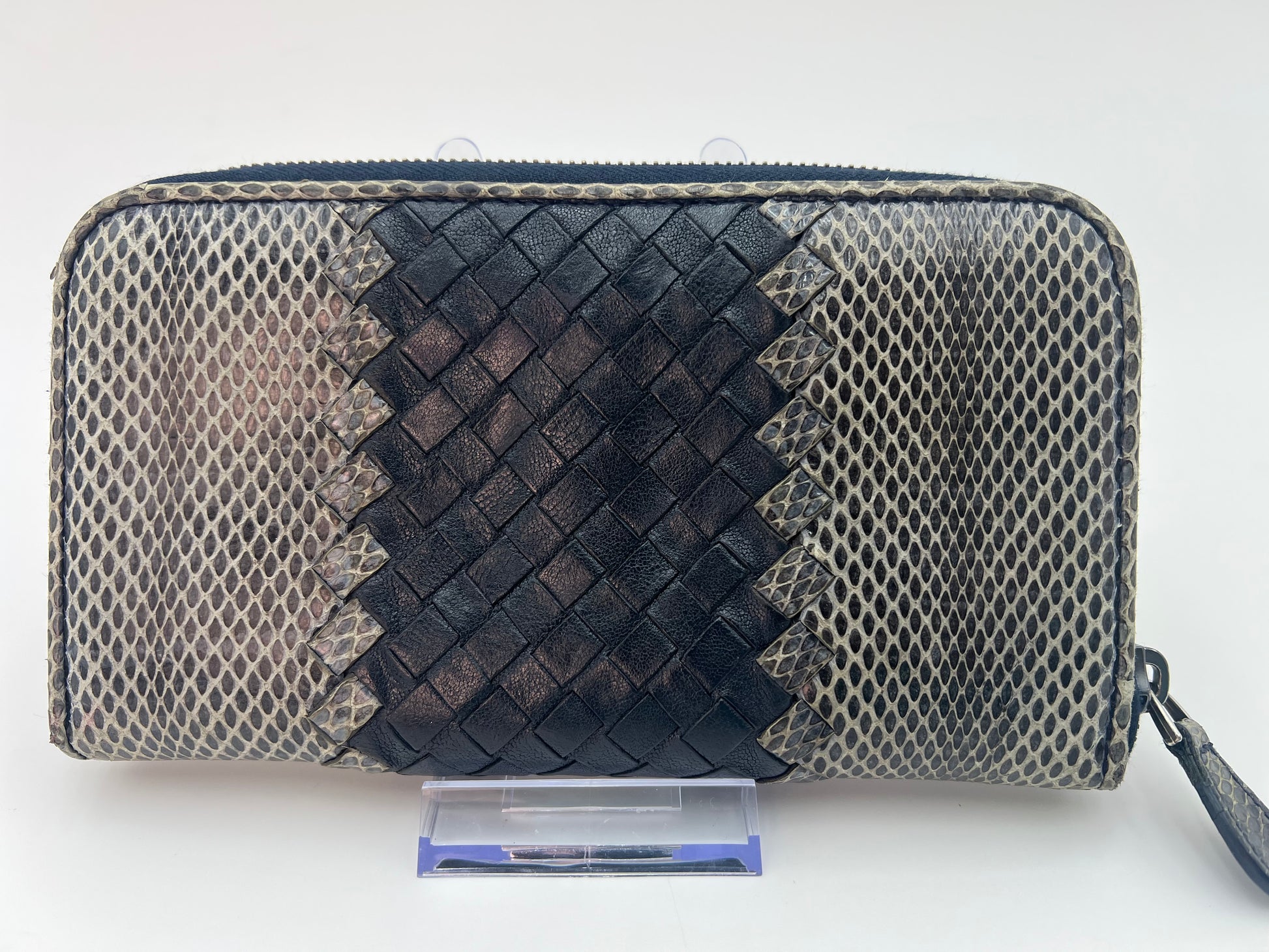 Signs of use throughout, no flaws to note. Wear to edges and zipper pulls. Clean interior. Navy leather and snake skin.
