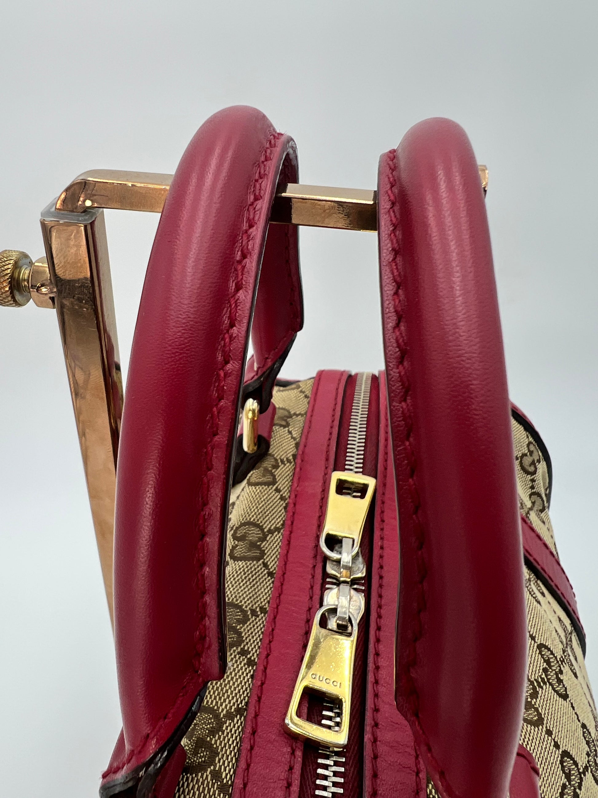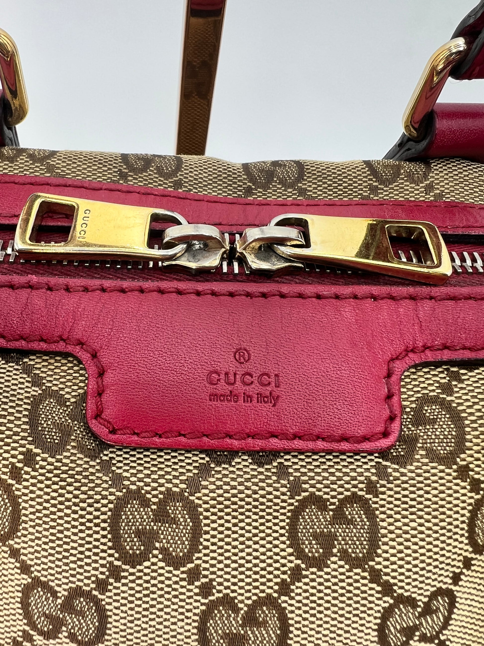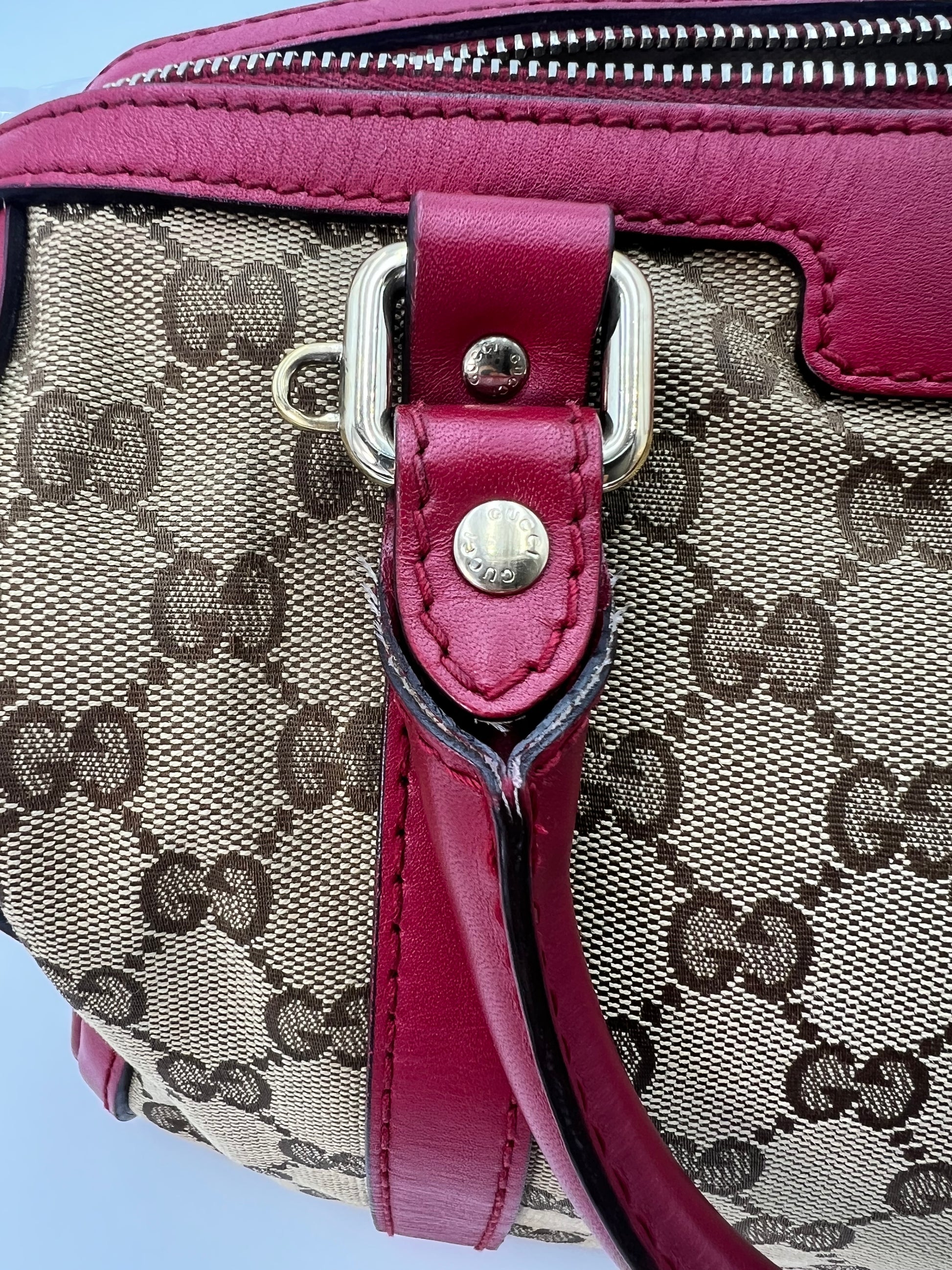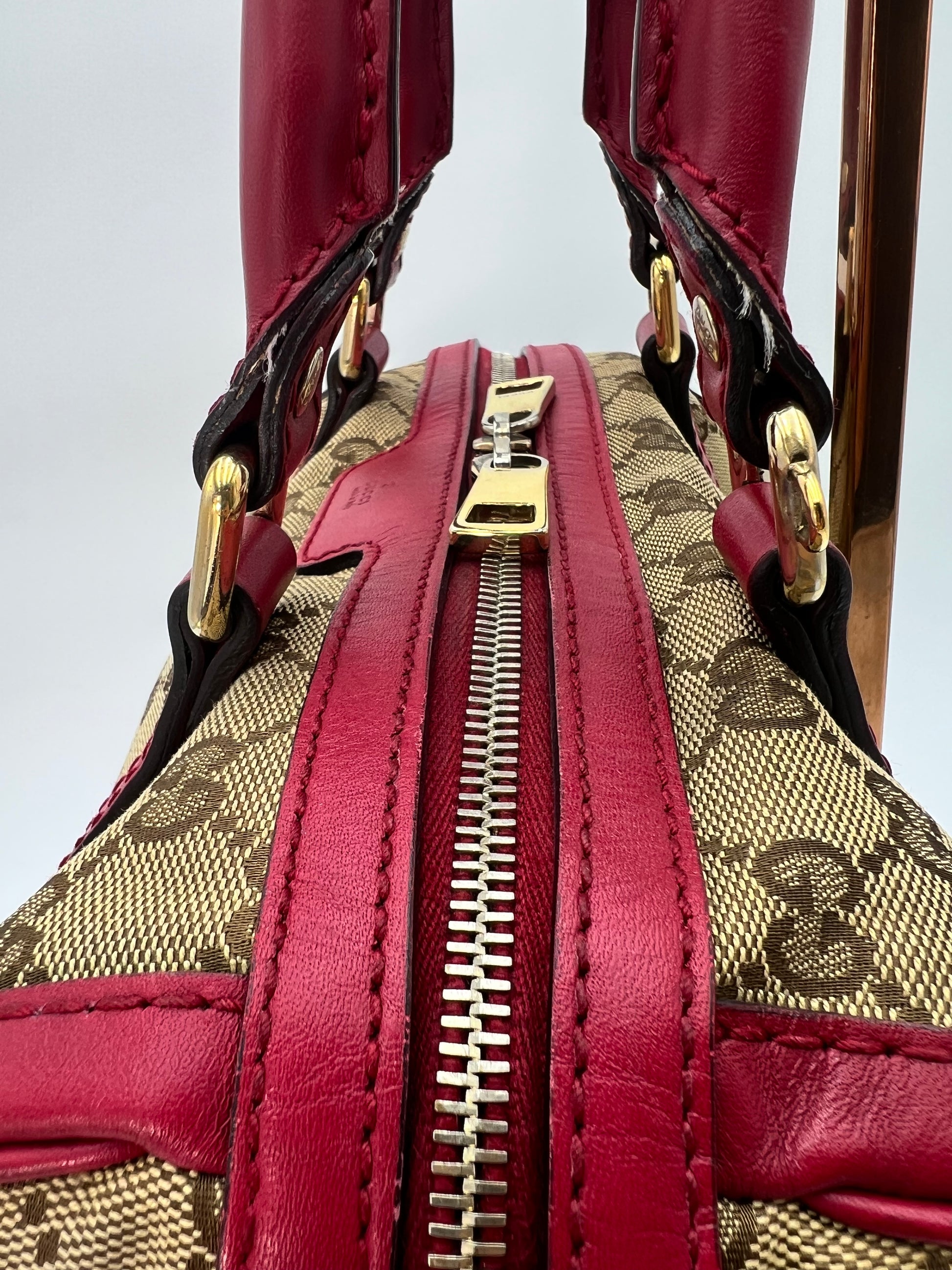Similar to a Louis Vuitton Speedy 25. Comes with crossbody strap. Dark pink leather trim. Exterior canvas and leather are in excellent condition. Minor wear to the handles and one small stain on the interior canvas. Zippers run smooth and all pockets are functional.