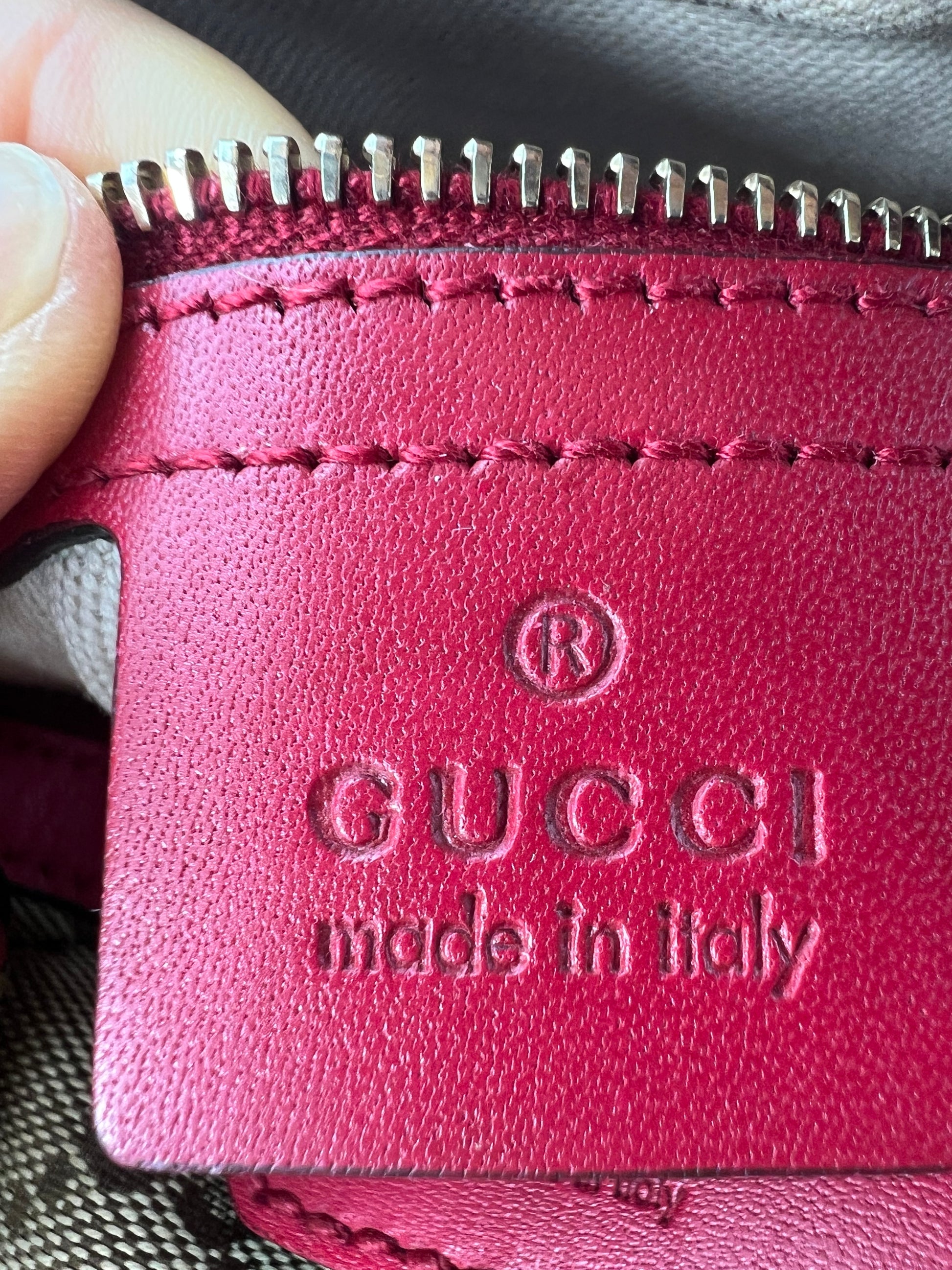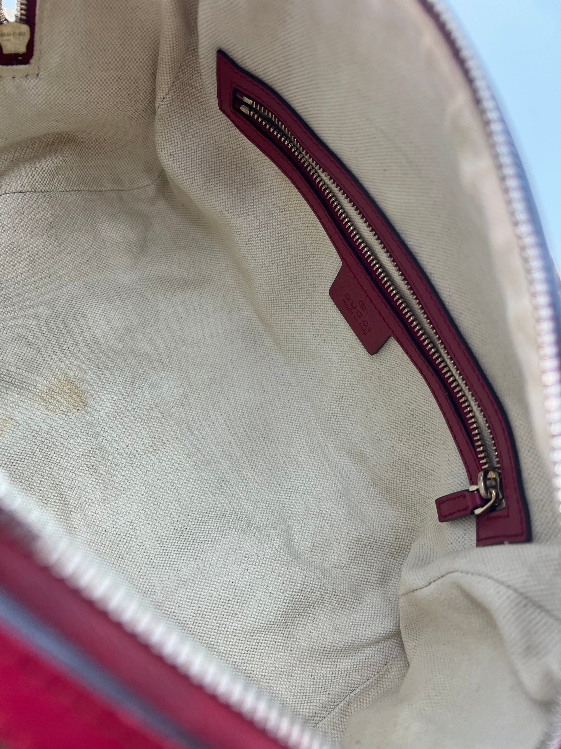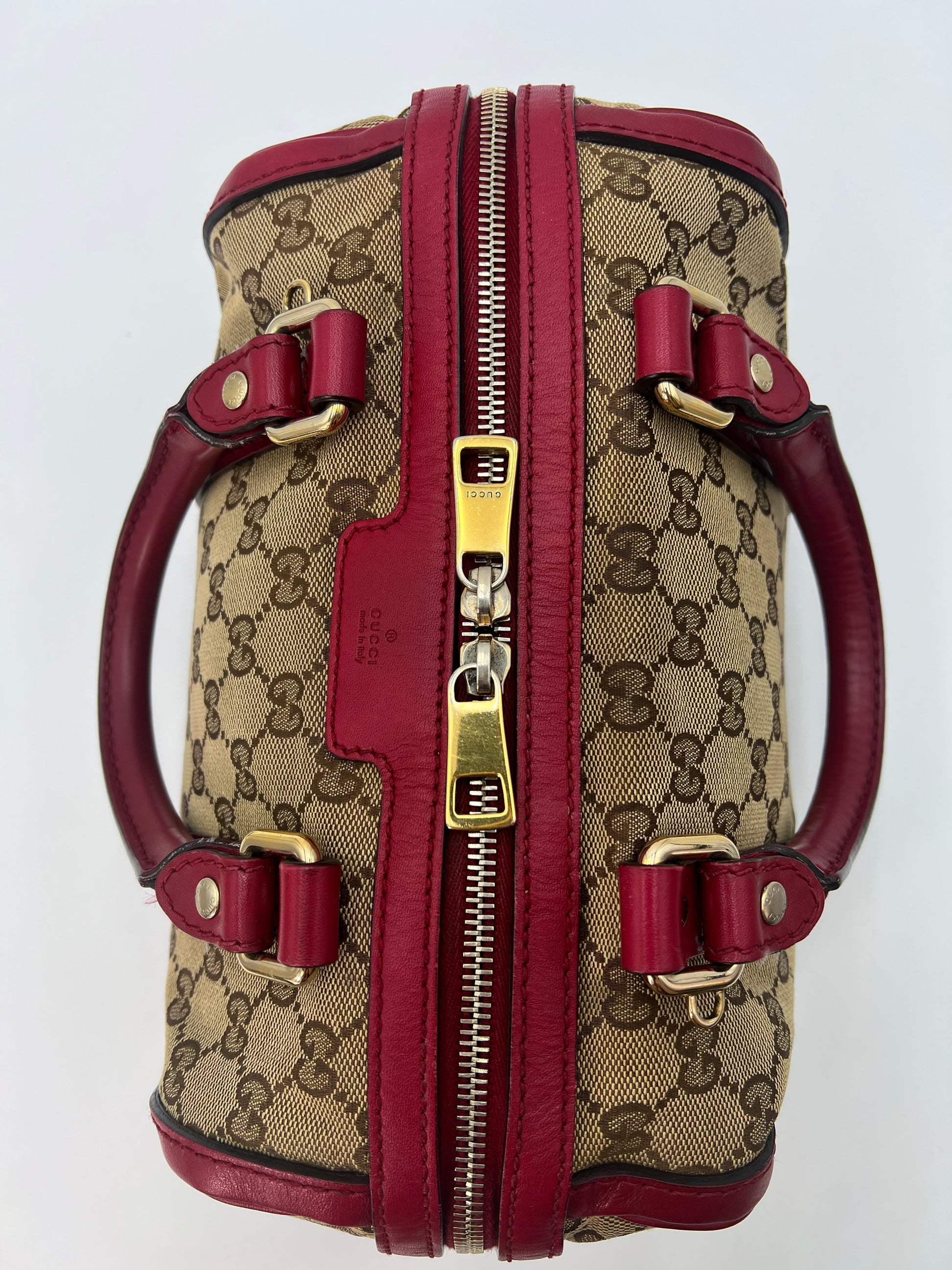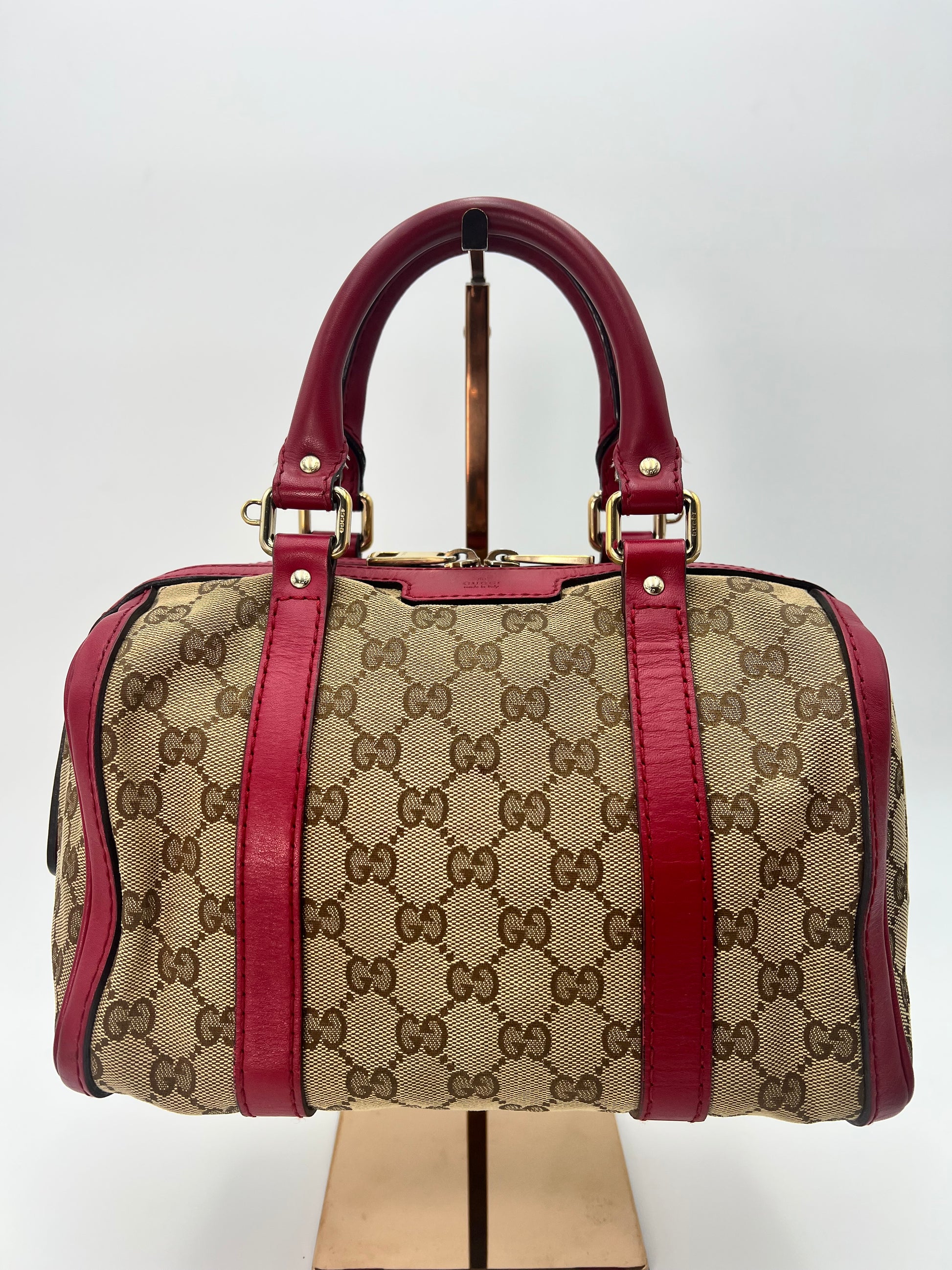 Similar to a Louis Vuitton Speedy 25. Comes with crossbody strap. Dark pink leather trim. Exterior canvas and leather are in excellent condition. Minor wear to the handles and one small stain on the interior canvas. Zippers run smooth and all pockets are functional.