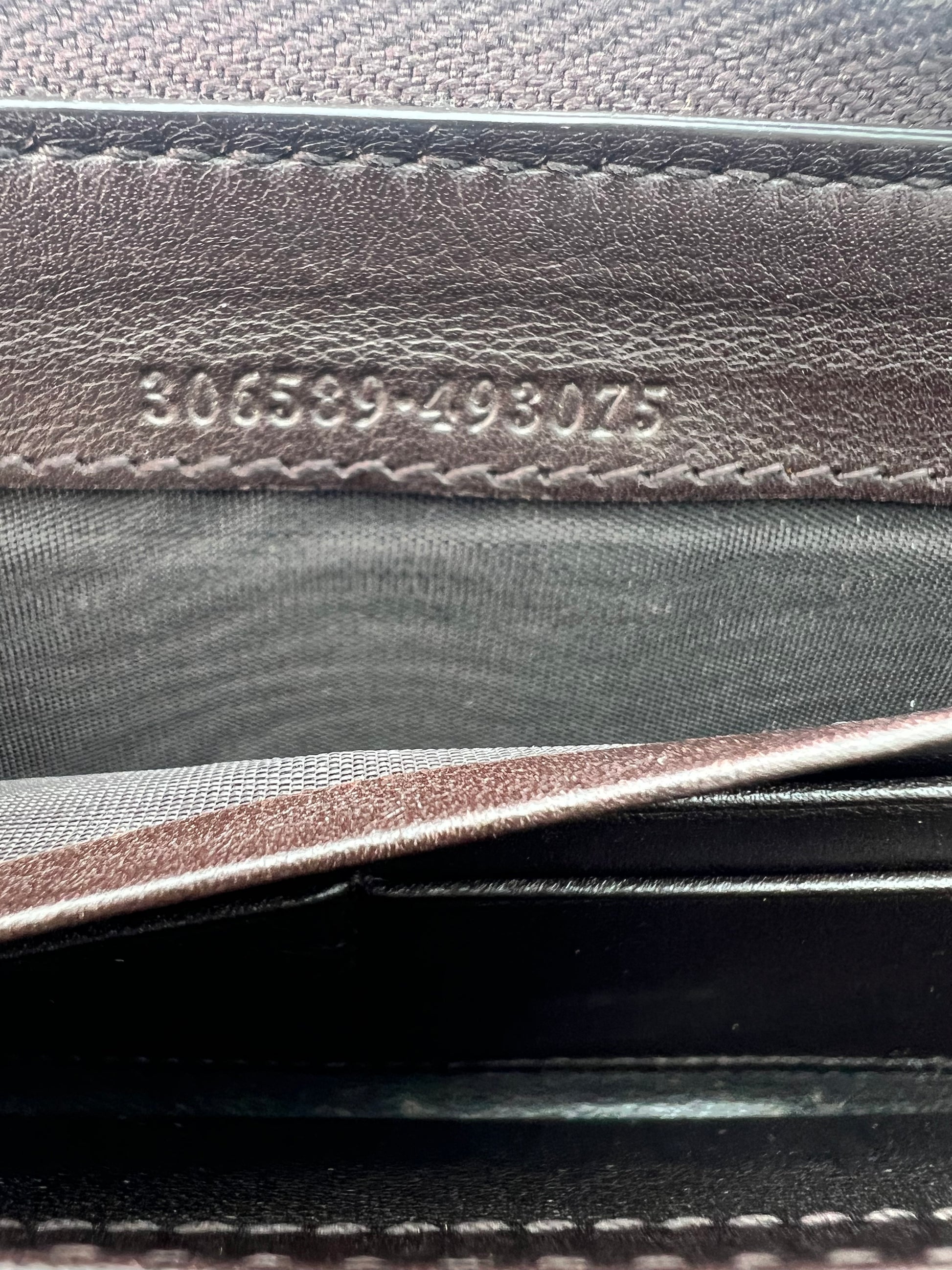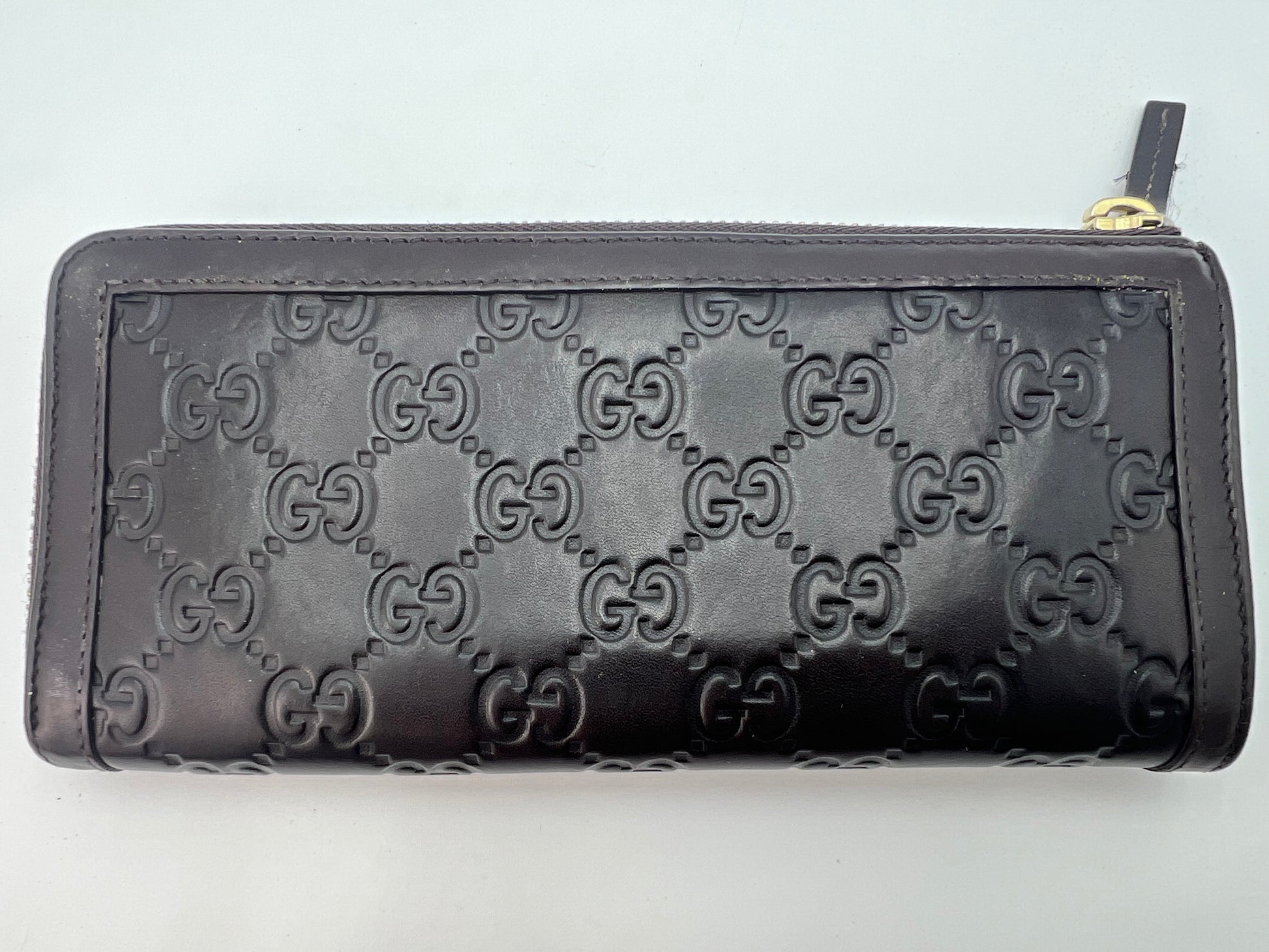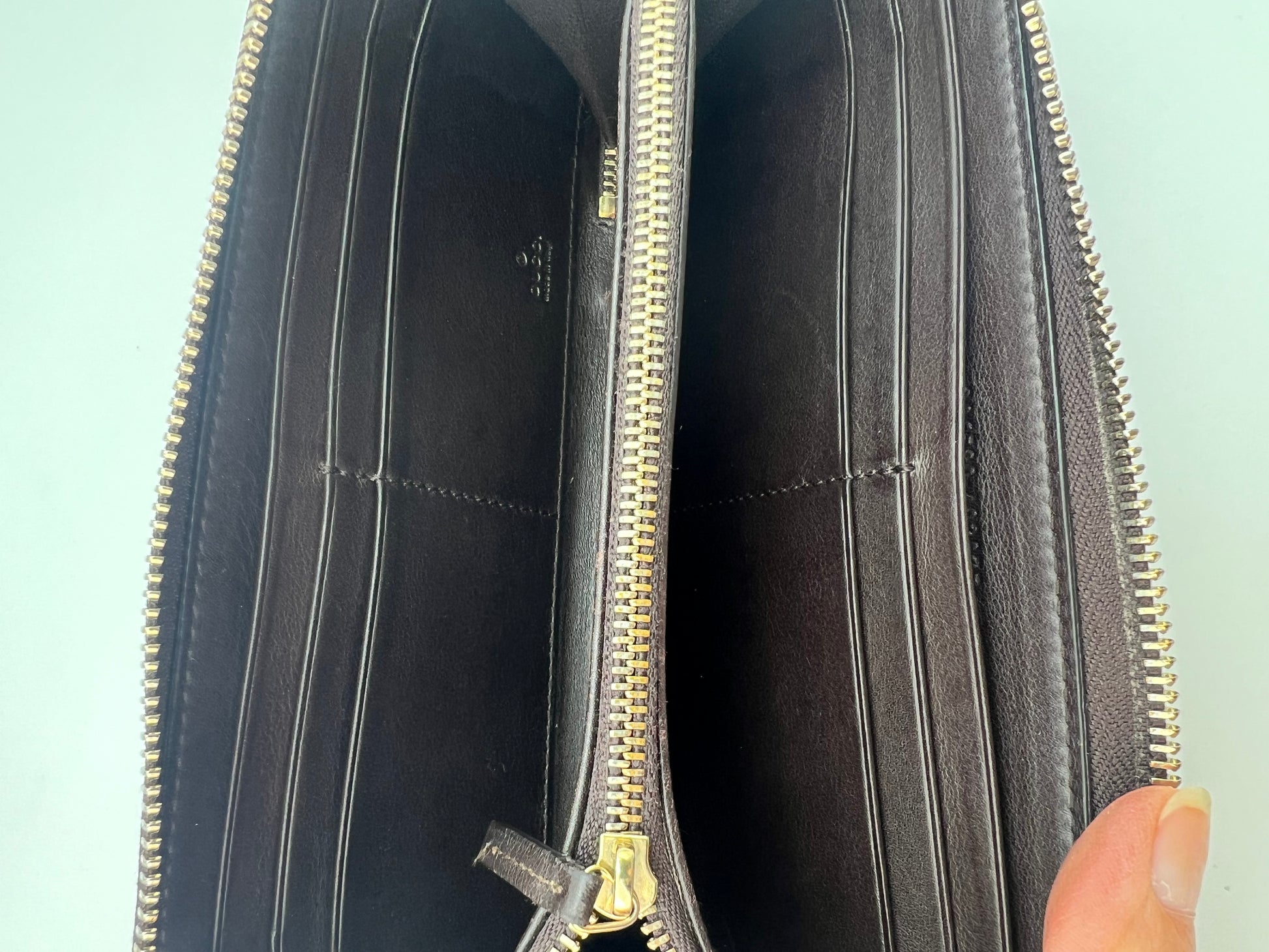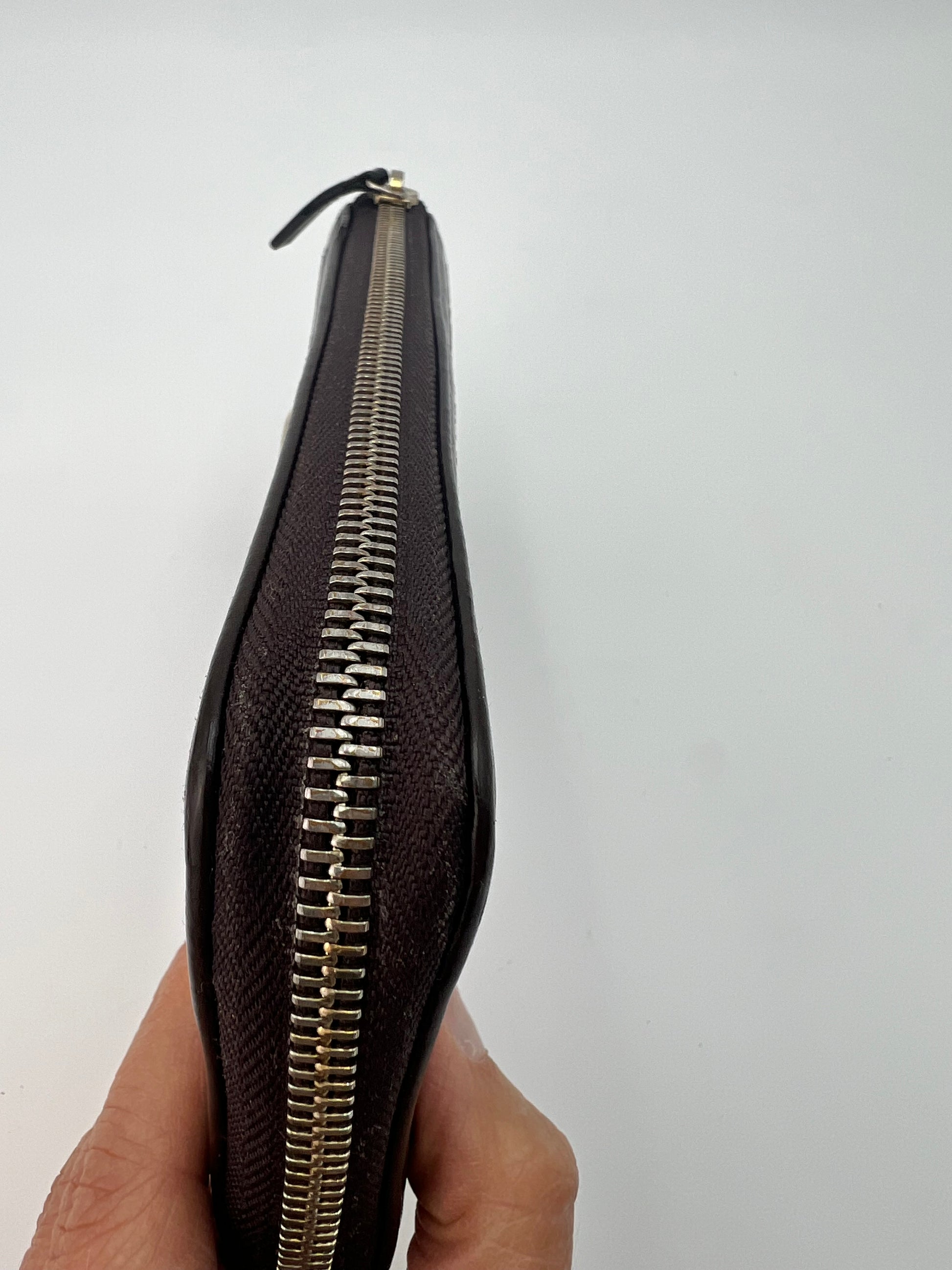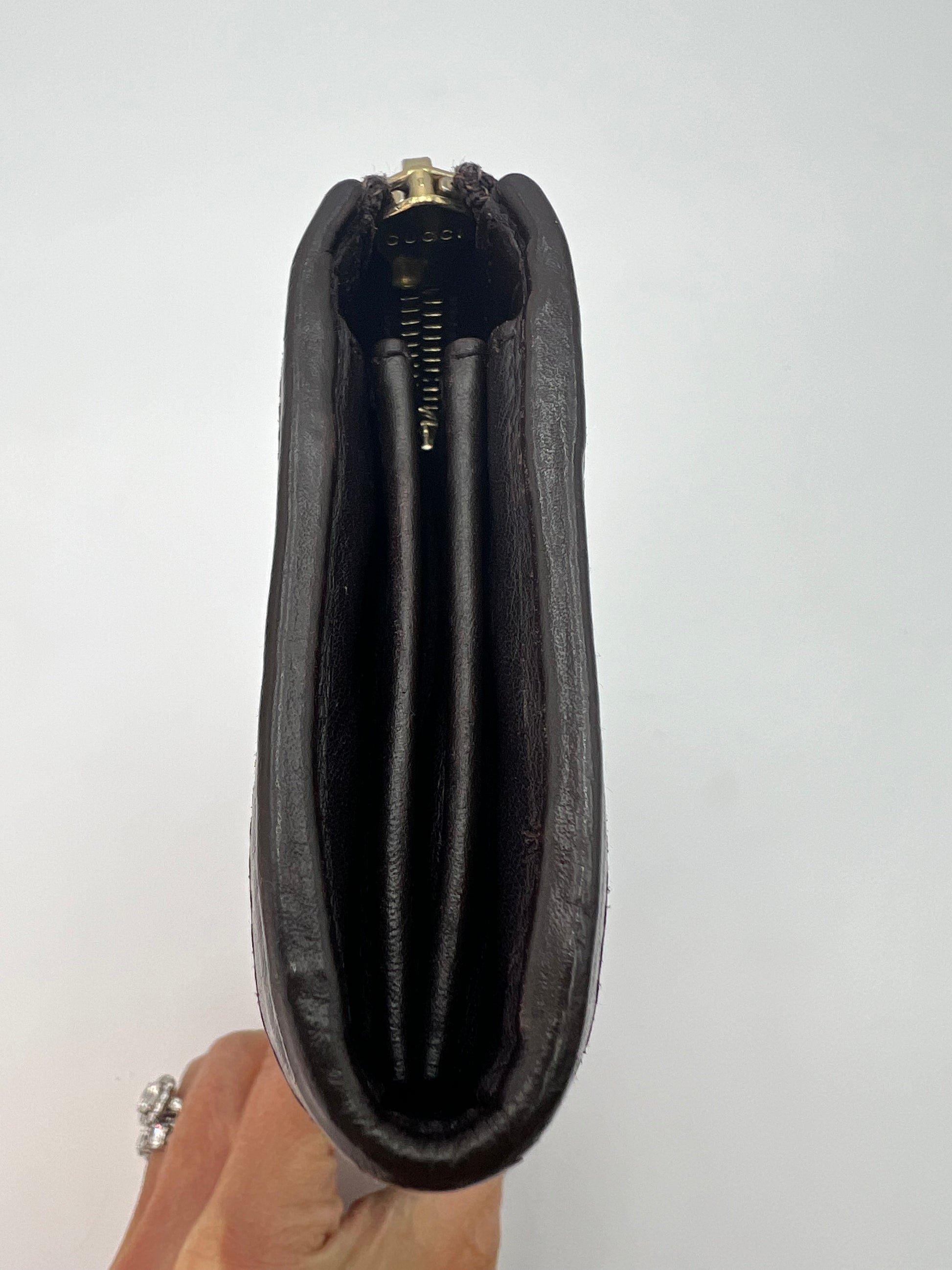 Chocolate brown. Light wear throughout. Rubbing on interlocking G front logo. Zippers are very smooth and the interior shows minimal use. Beautiful leather wallet. Please review photos carefully and feel free to ask questions.