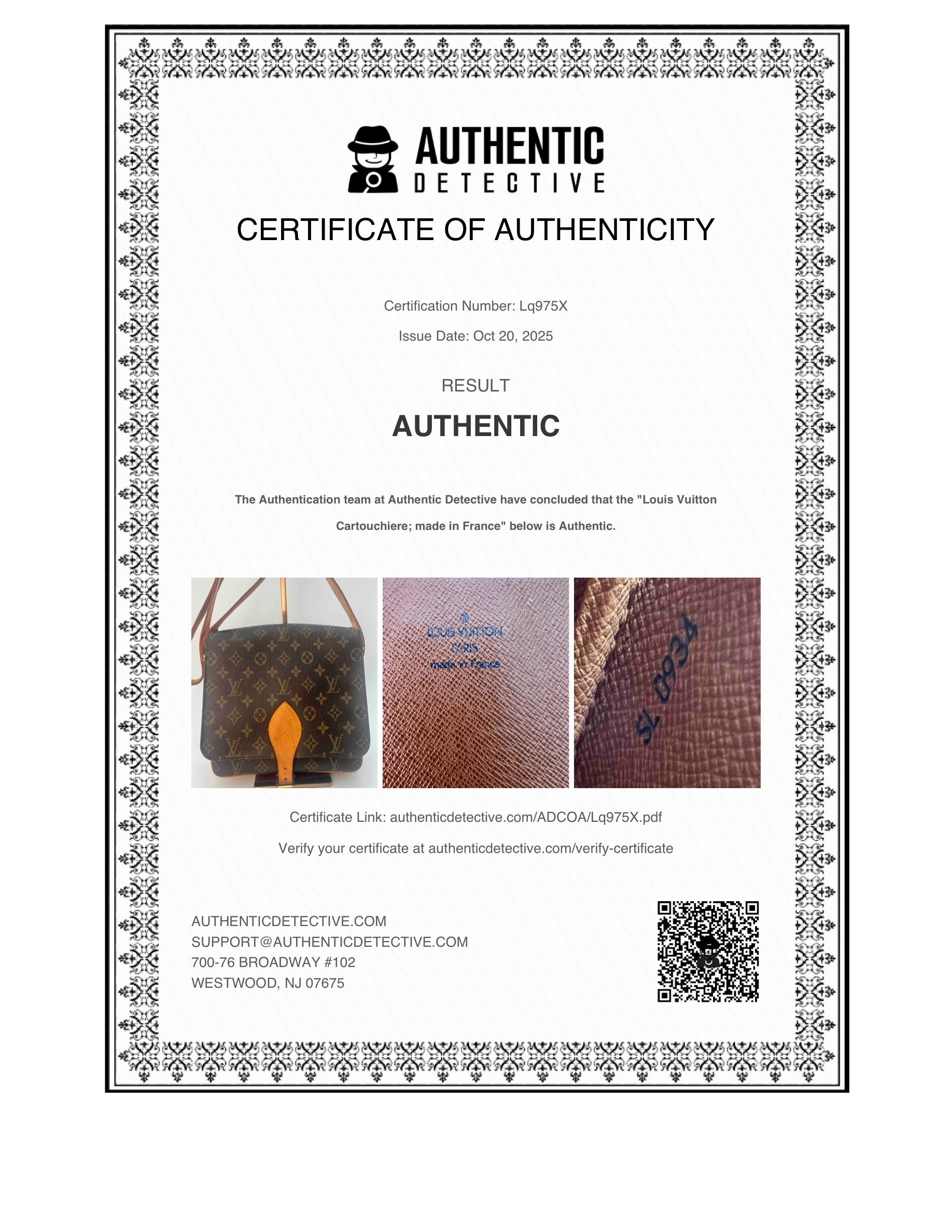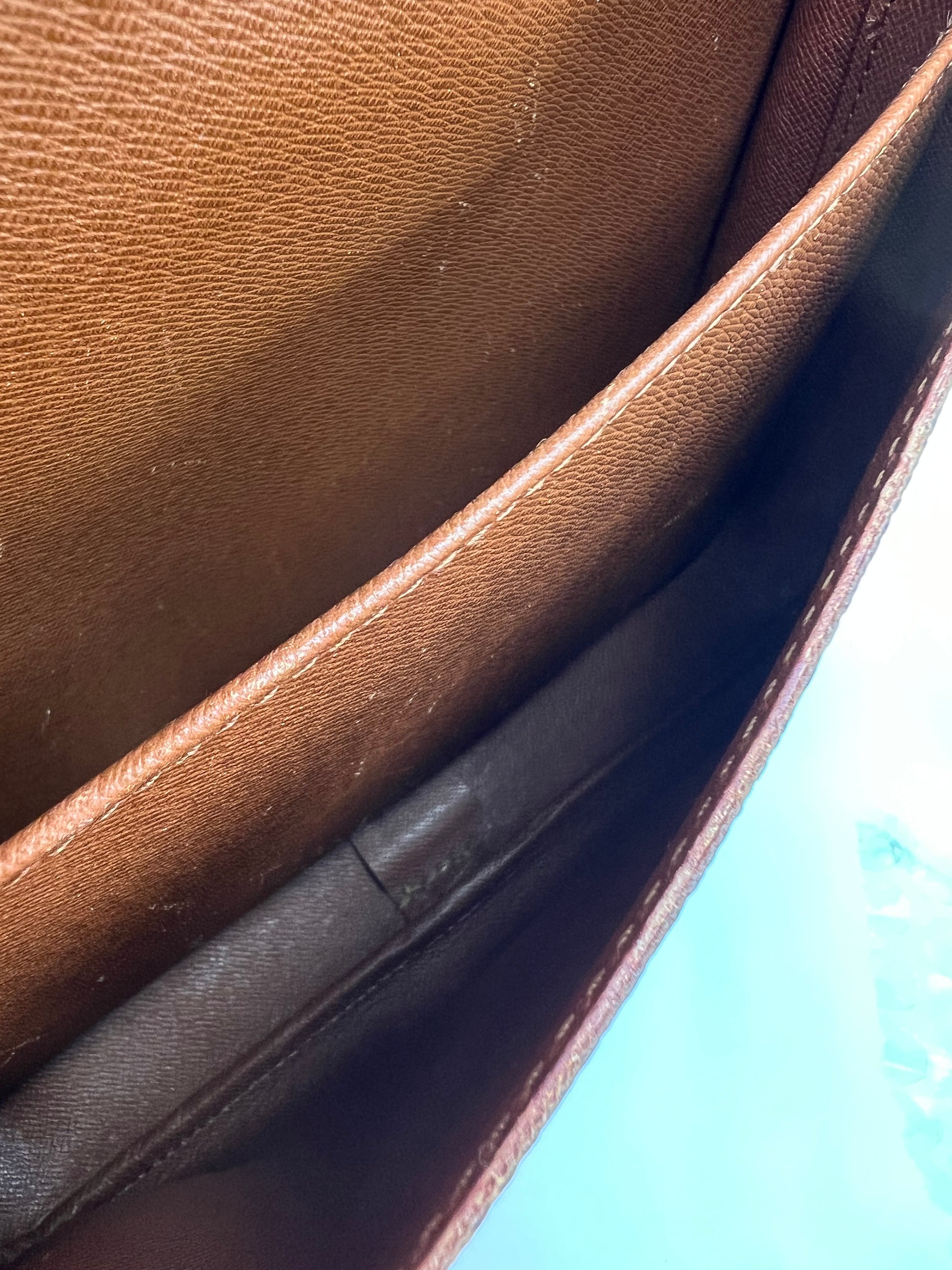 Moderate signs of wear throughout. Light water spots on leather. Monogram canvas is bright and in good condition. Leather strap is removable, adjustable, in good condition (minor cracks and staining). Interior shows minimal signs of wear. No peeling pockets!