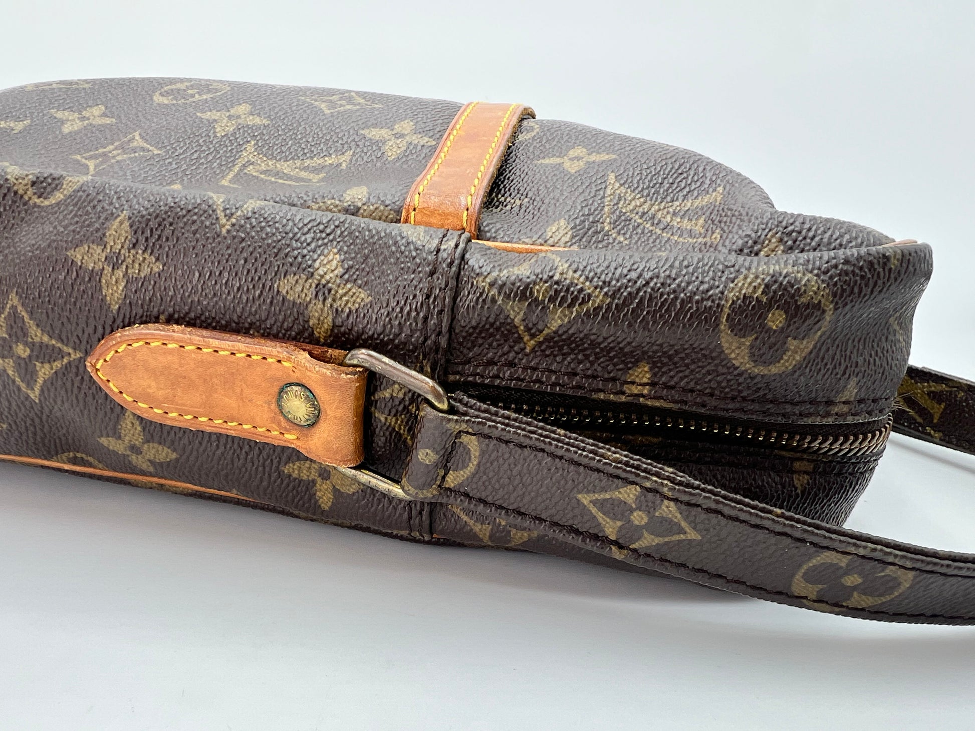 A lovely vintage consignment piece, with beautiful patina on the leather throughout. Peeling in both the exterior slide pocket and interior slide pocket (both are functional and able to be used). Interior main compartment is clean and functional, zipper runs smoothly. Please review photos carefully.