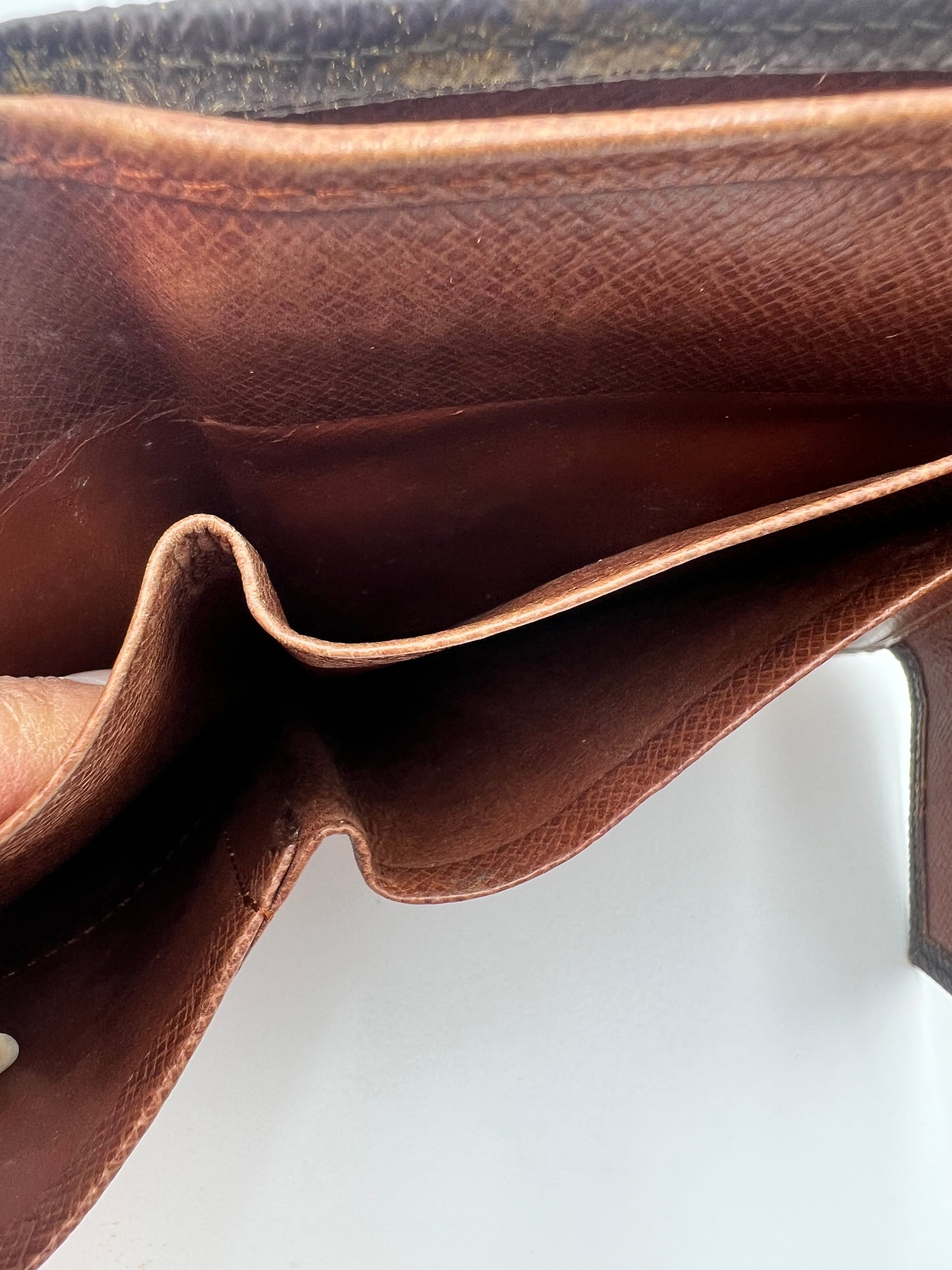 General wear and use throughout. This Louis Vuitton trifold Elise monogram wallet was manufactured in the 1980’s! No major flaws, pockets are clean and functional, snaps fasten properly. Please review photos carefully and feel free to ask questions.