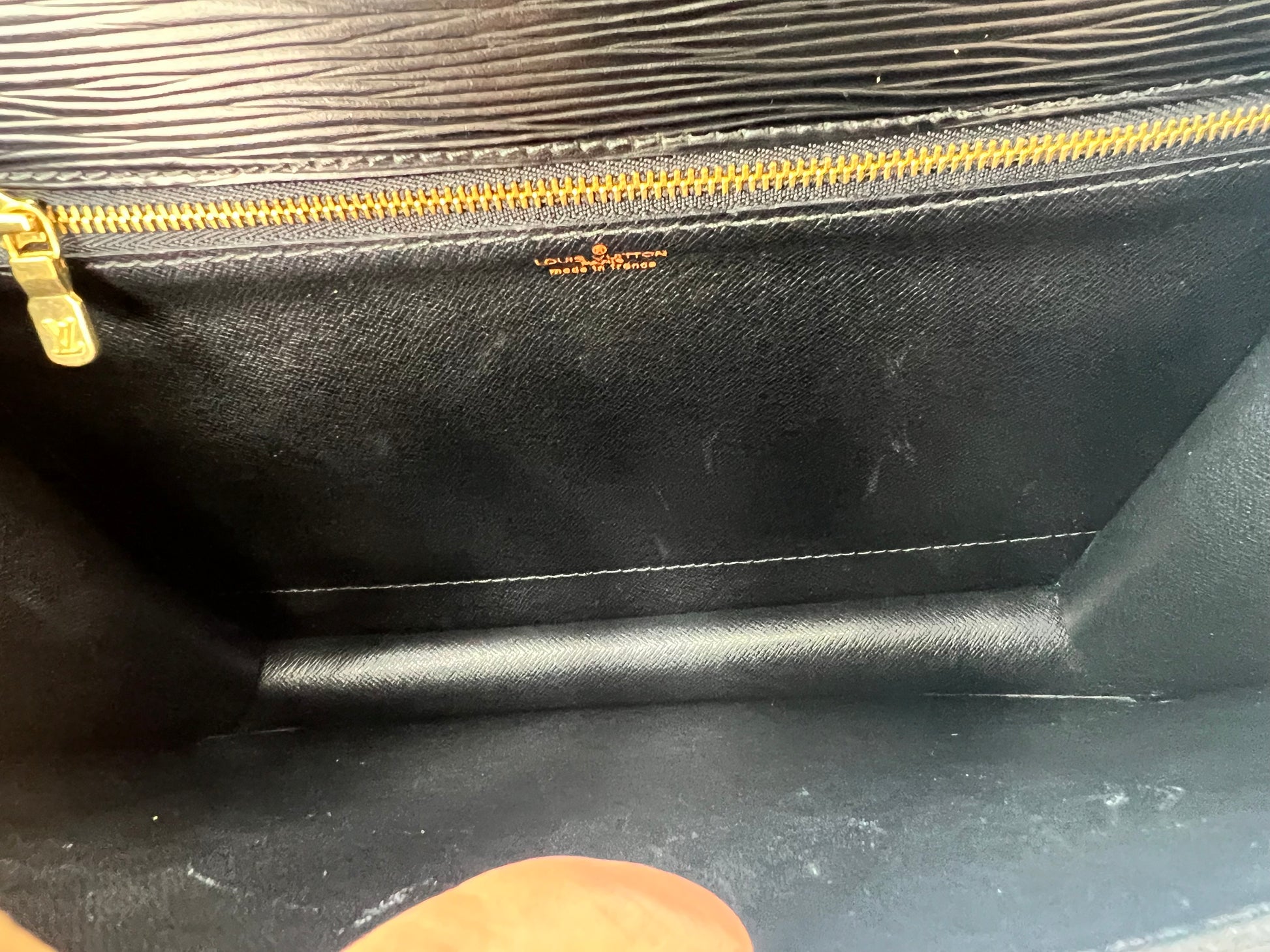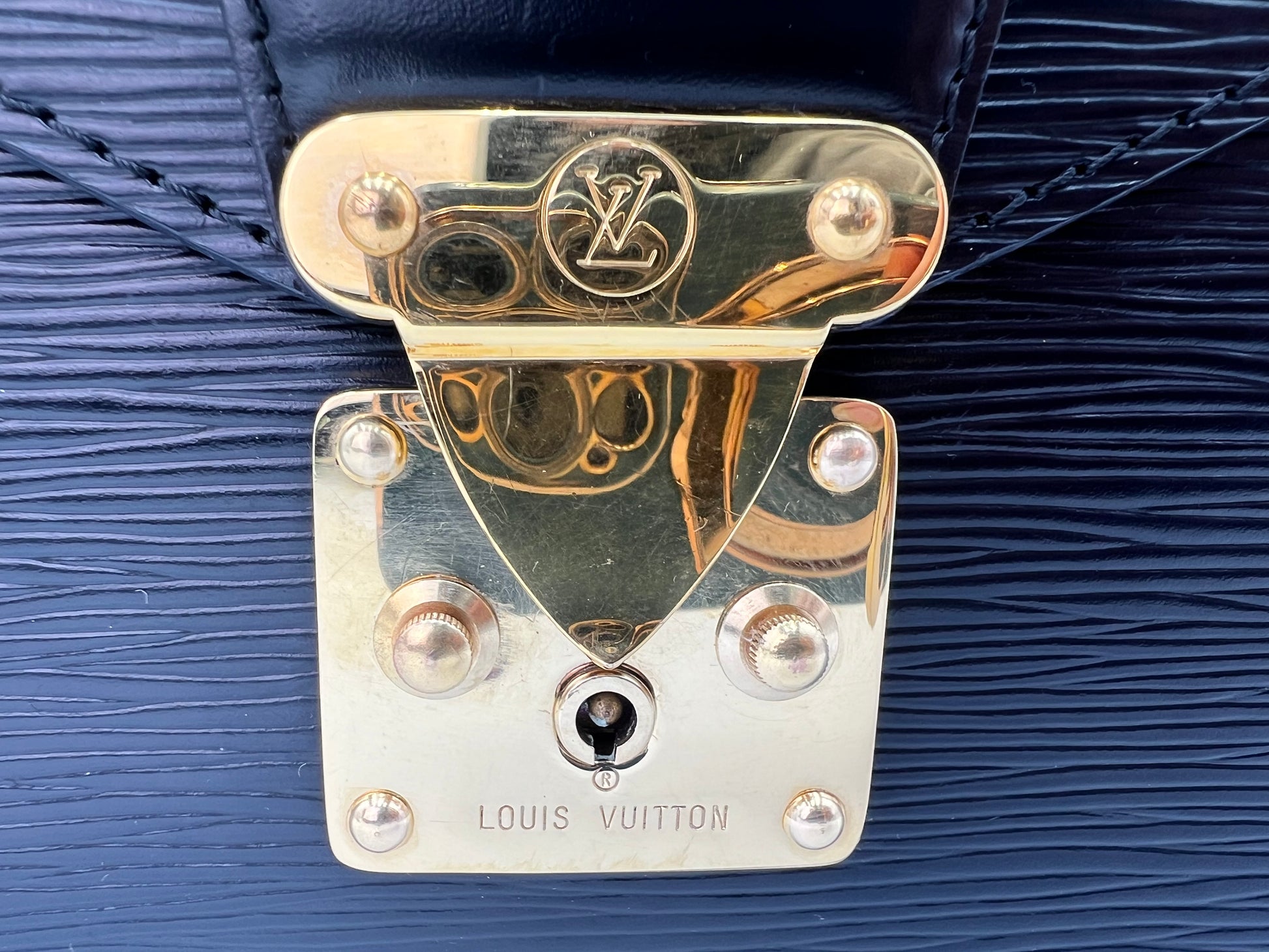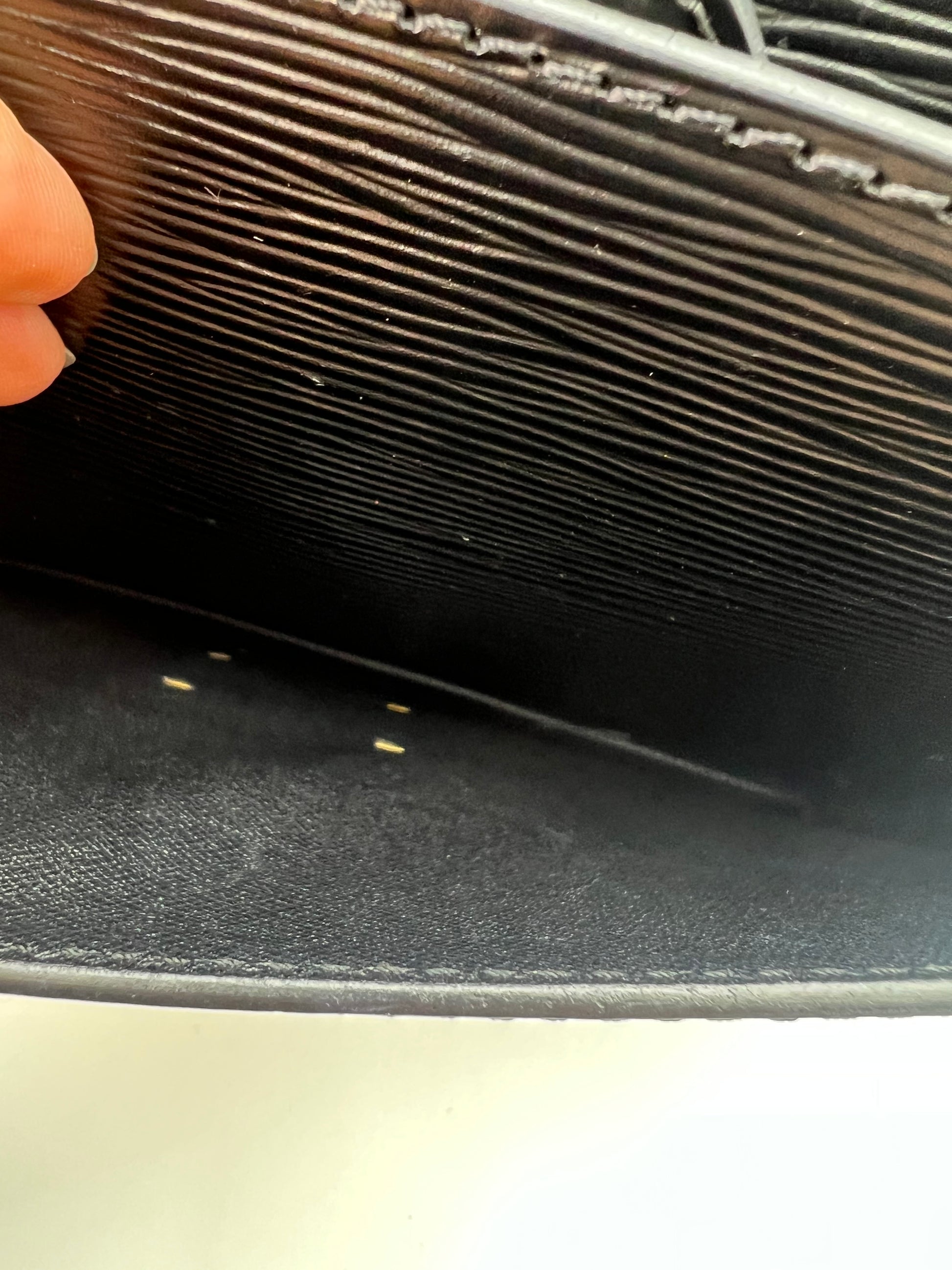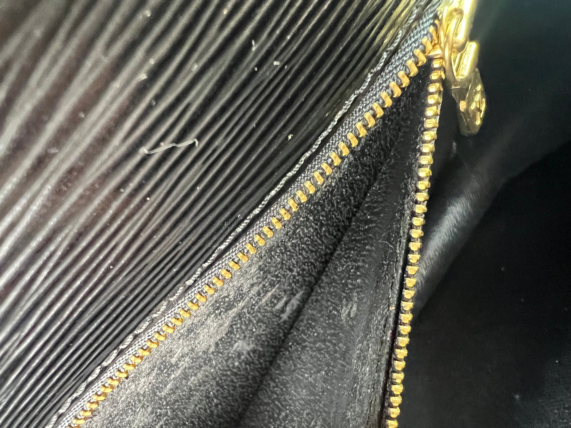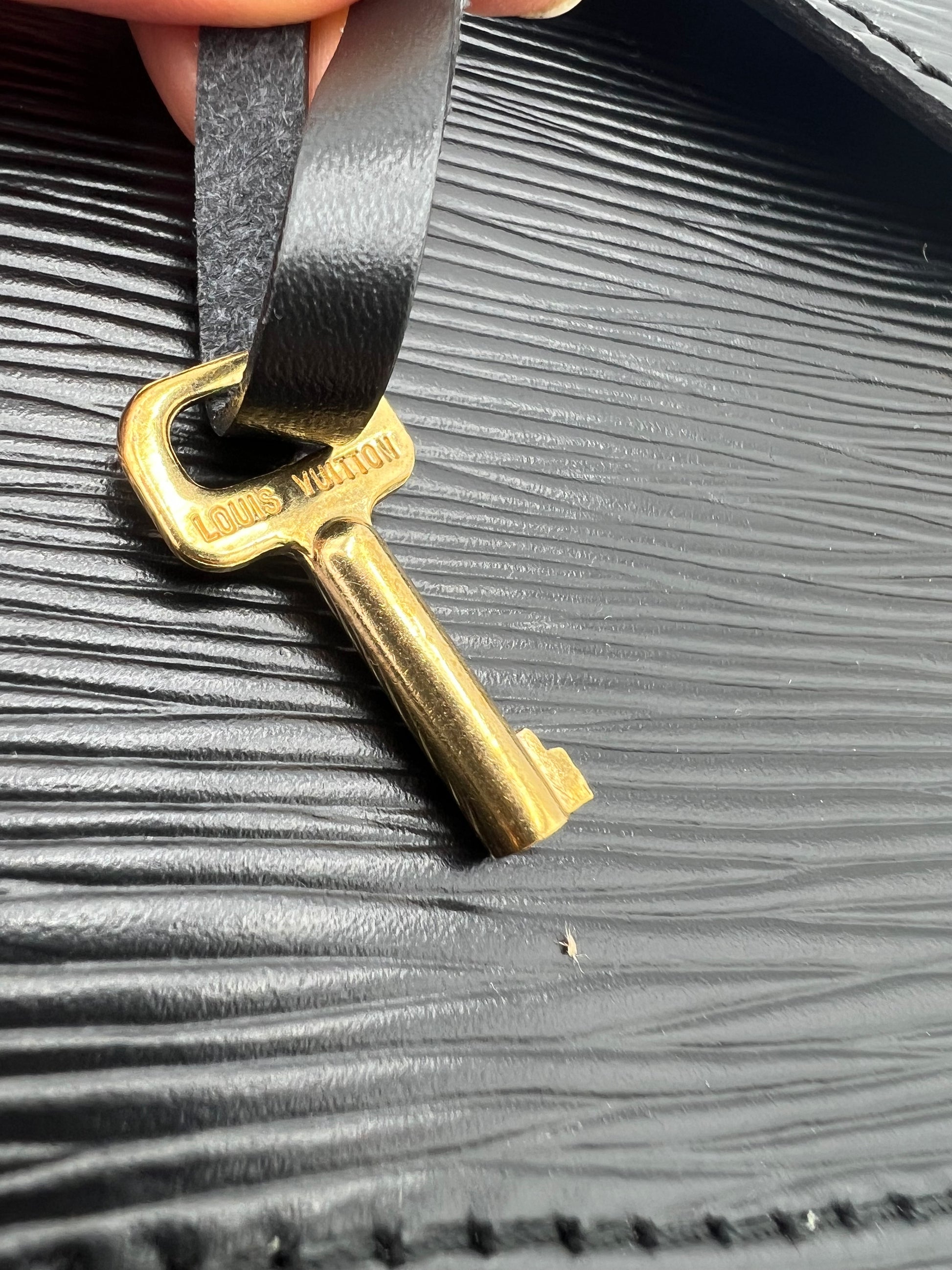 Exterior and interior main compartments are in excellent condition. Handles shows minimal signs of wear, d-ring hardware has tarnishing, light scratches on front lock. Peeling in interior zipper pocket. Comes with black leather strap (not original to the bag), so that it can be worn crossbody, also comes with the original key.