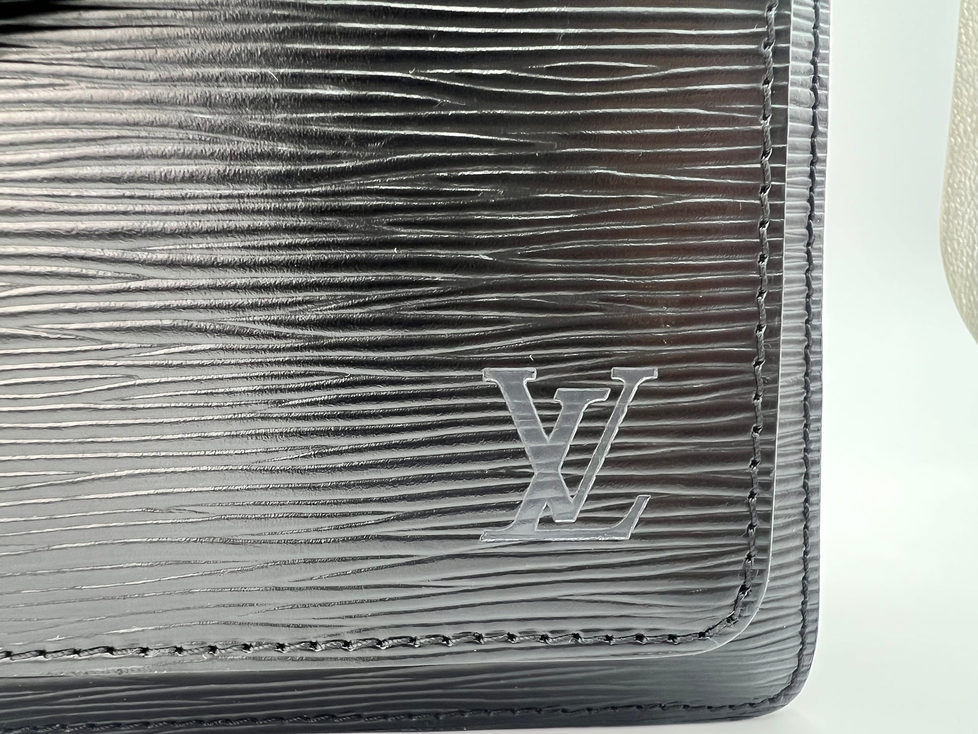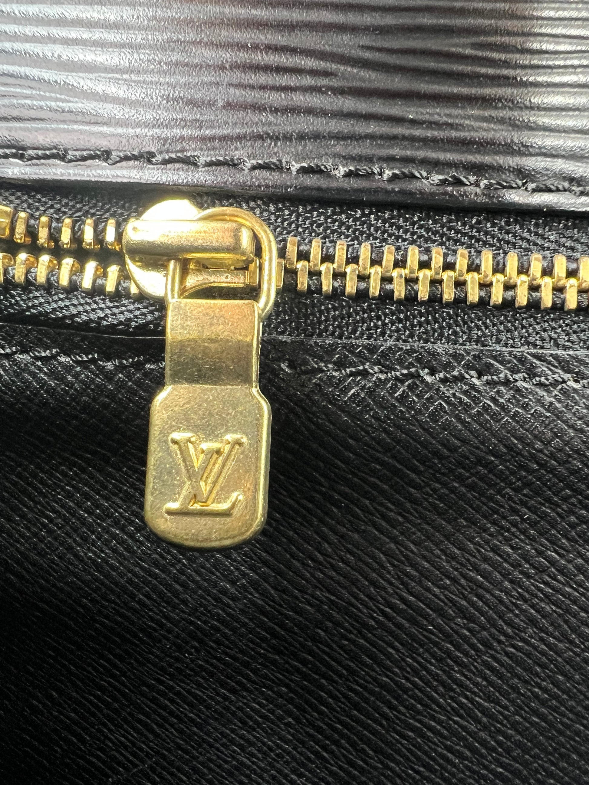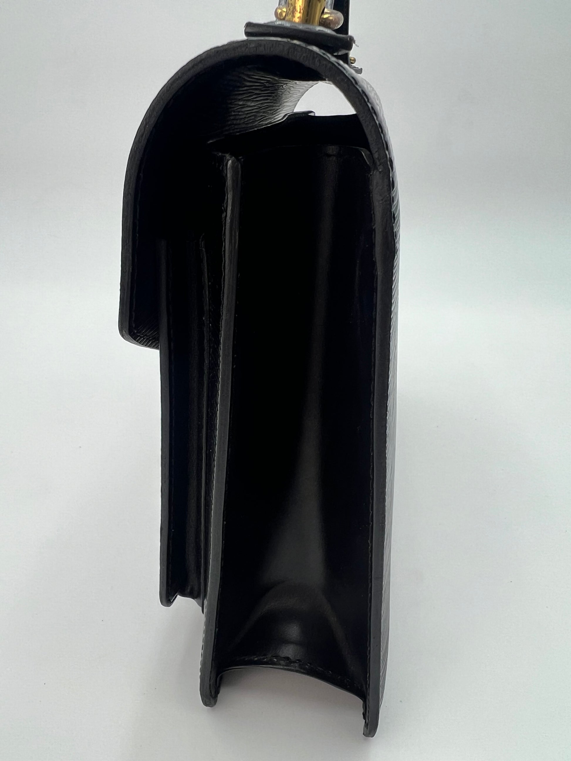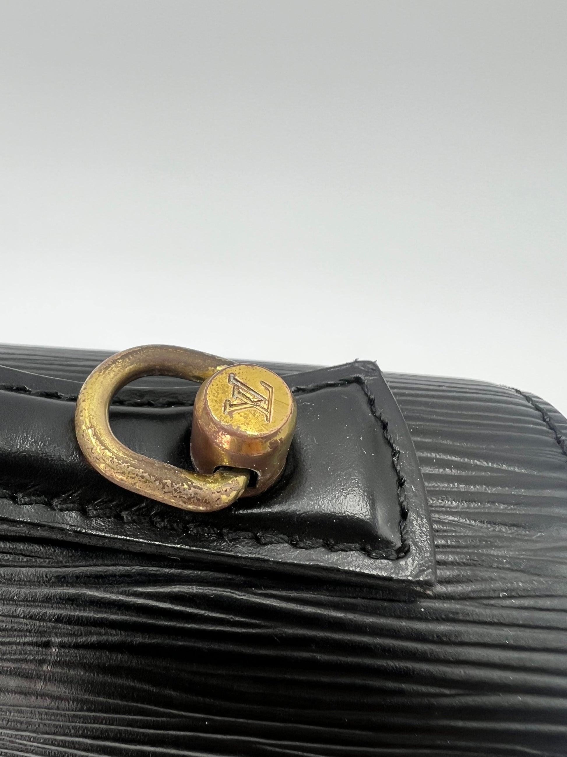 Exterior and interior main compartments are in excellent condition. Handles shows minimal signs of wear, d-ring hardware has tarnishing, light scratches on front lock. Peeling in interior zipper pocket. Comes with black leather strap (not original to the bag), so that it can be worn crossbody, also comes with the original key.