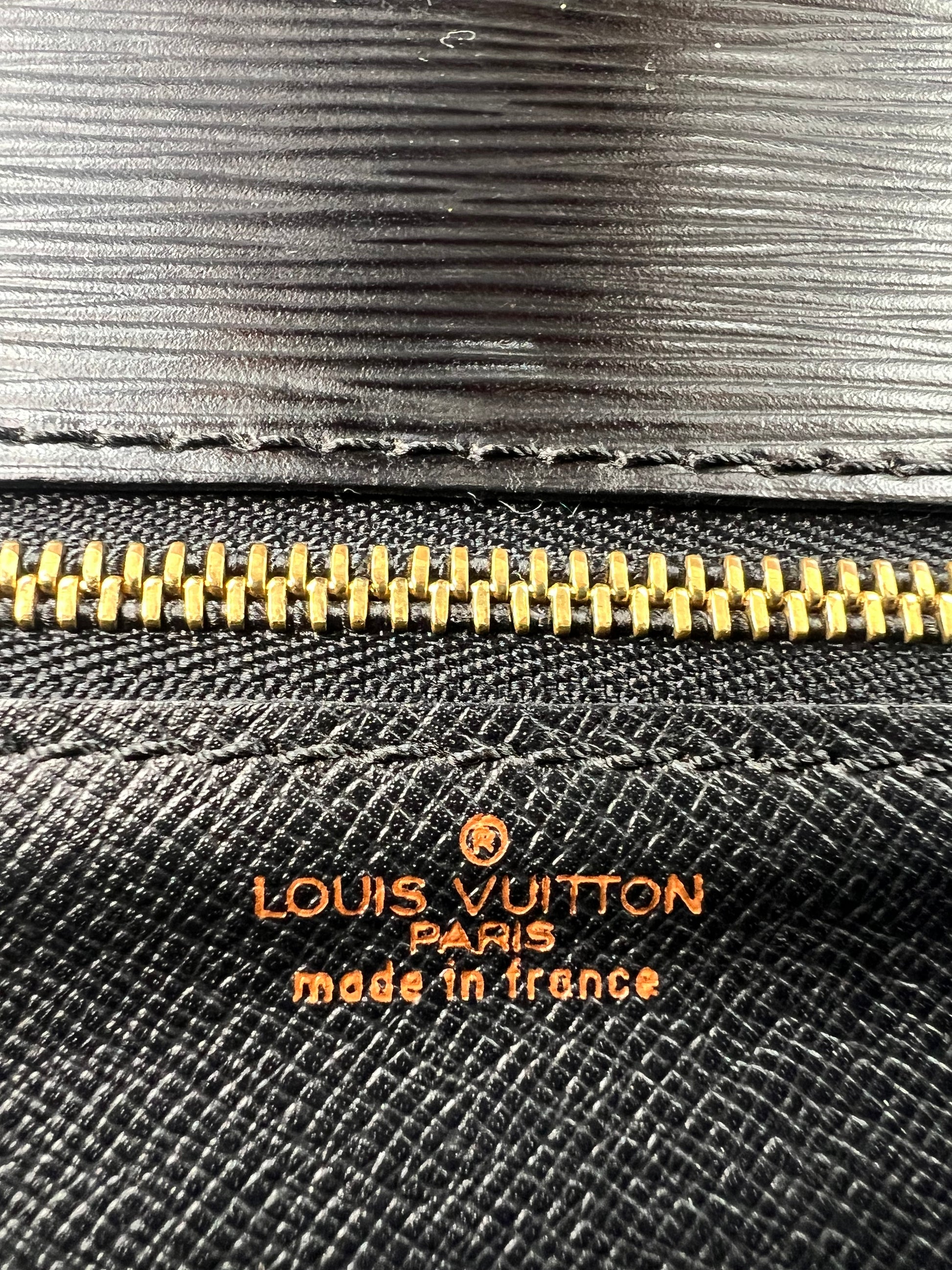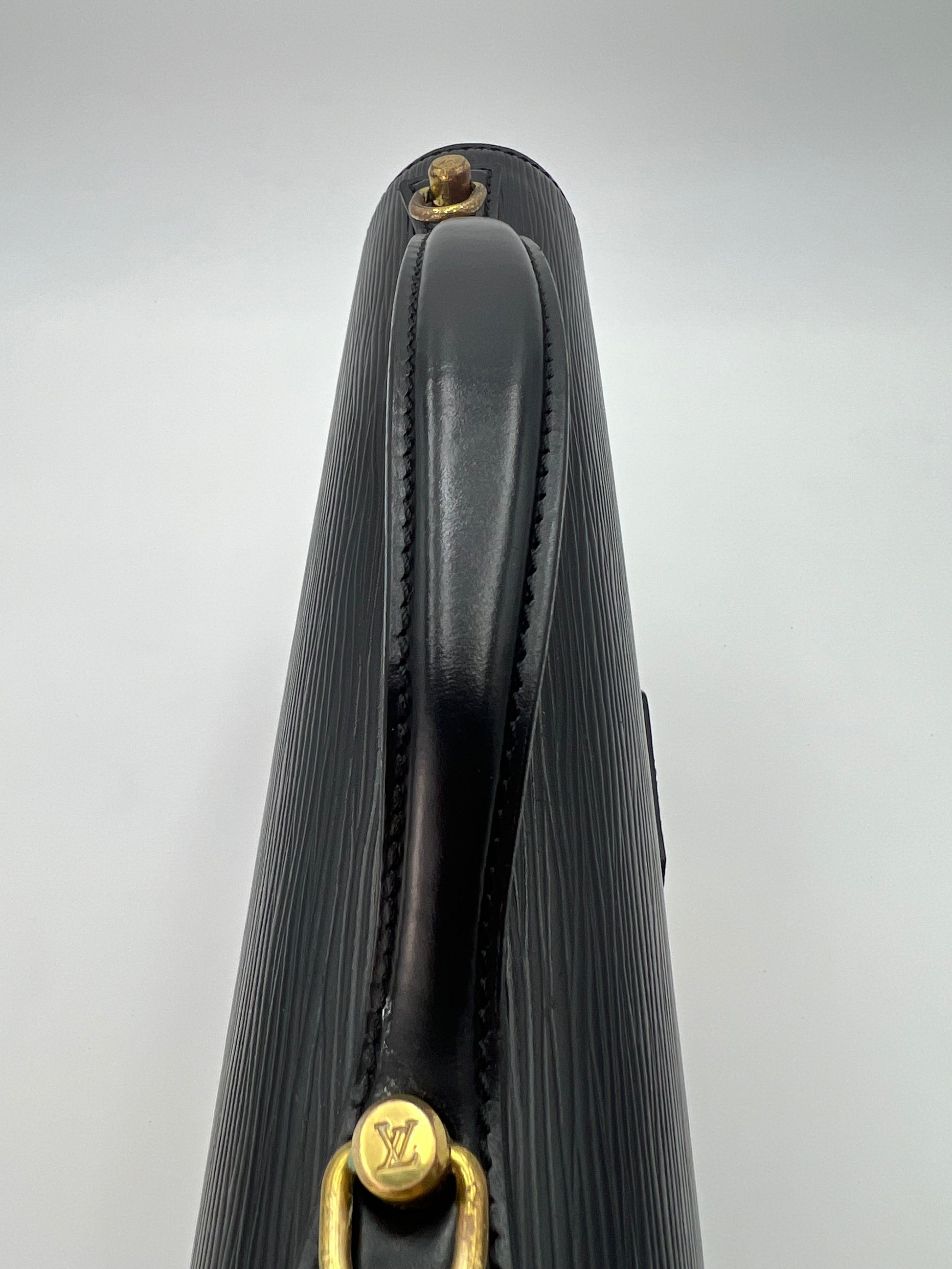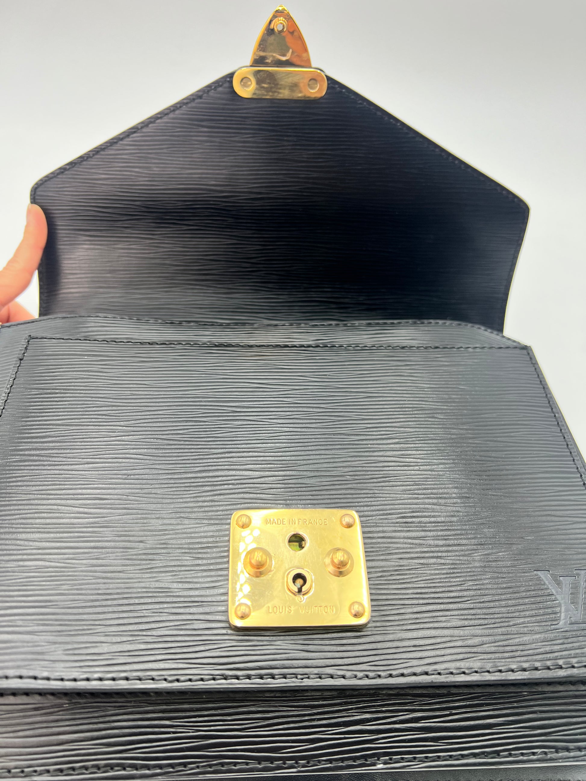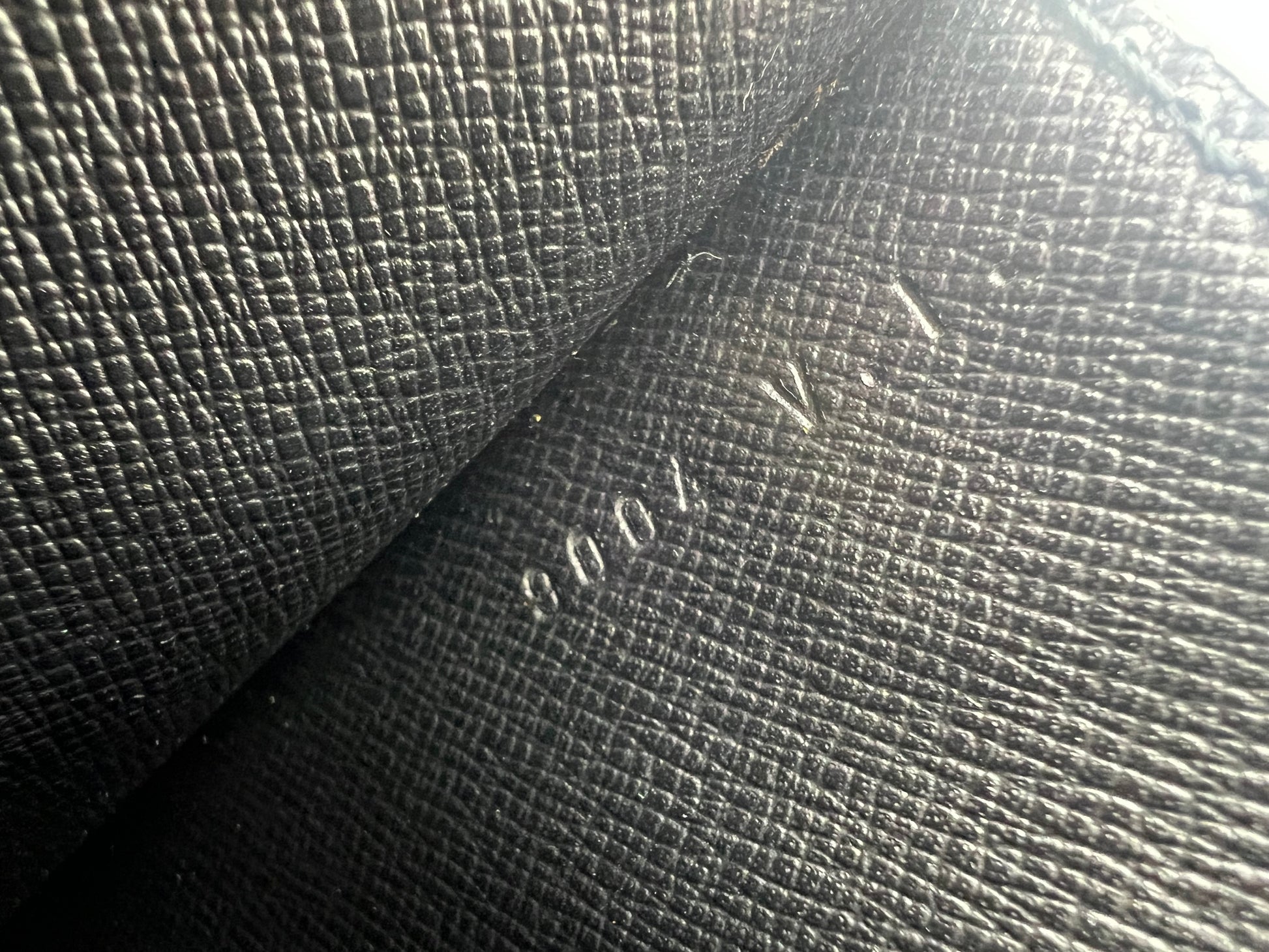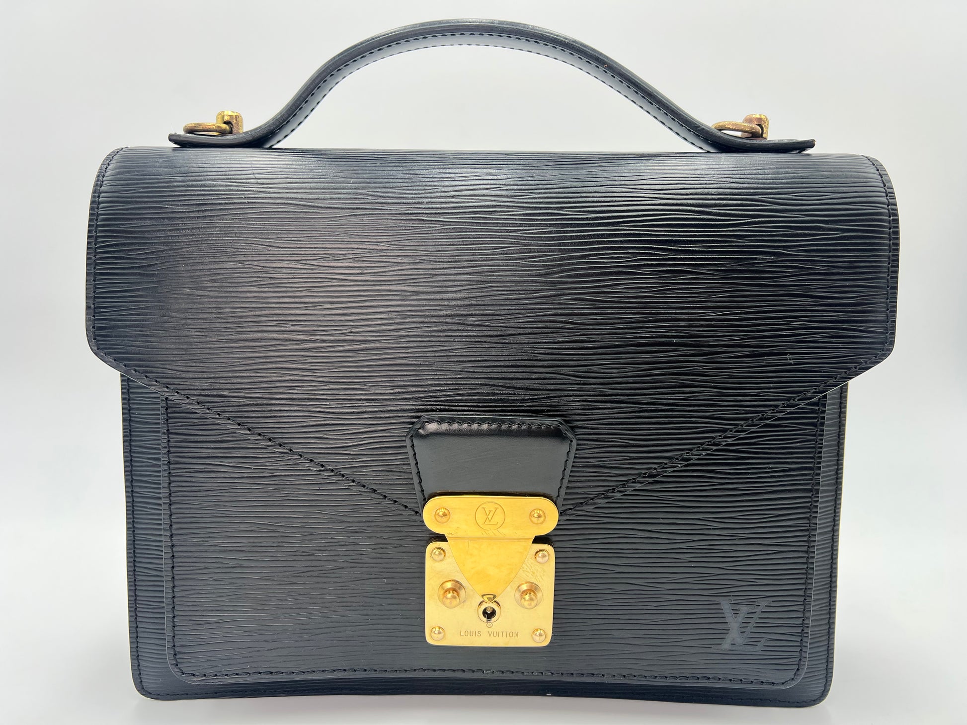 Exterior and interior main compartments are in excellent condition. Handles shows minimal signs of wear, d-ring hardware has tarnishing, light scratches on front lock. Peeling in interior zipper pocket. Comes with black leather strap (not original to the bag), so that it can be worn crossbody, also comes with the original key.