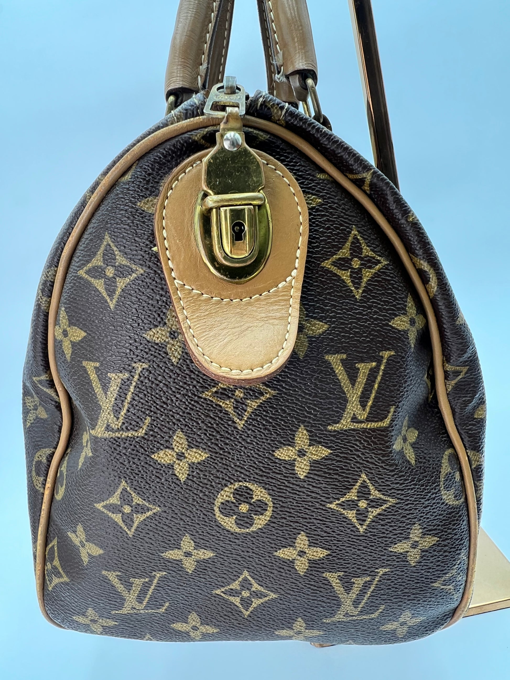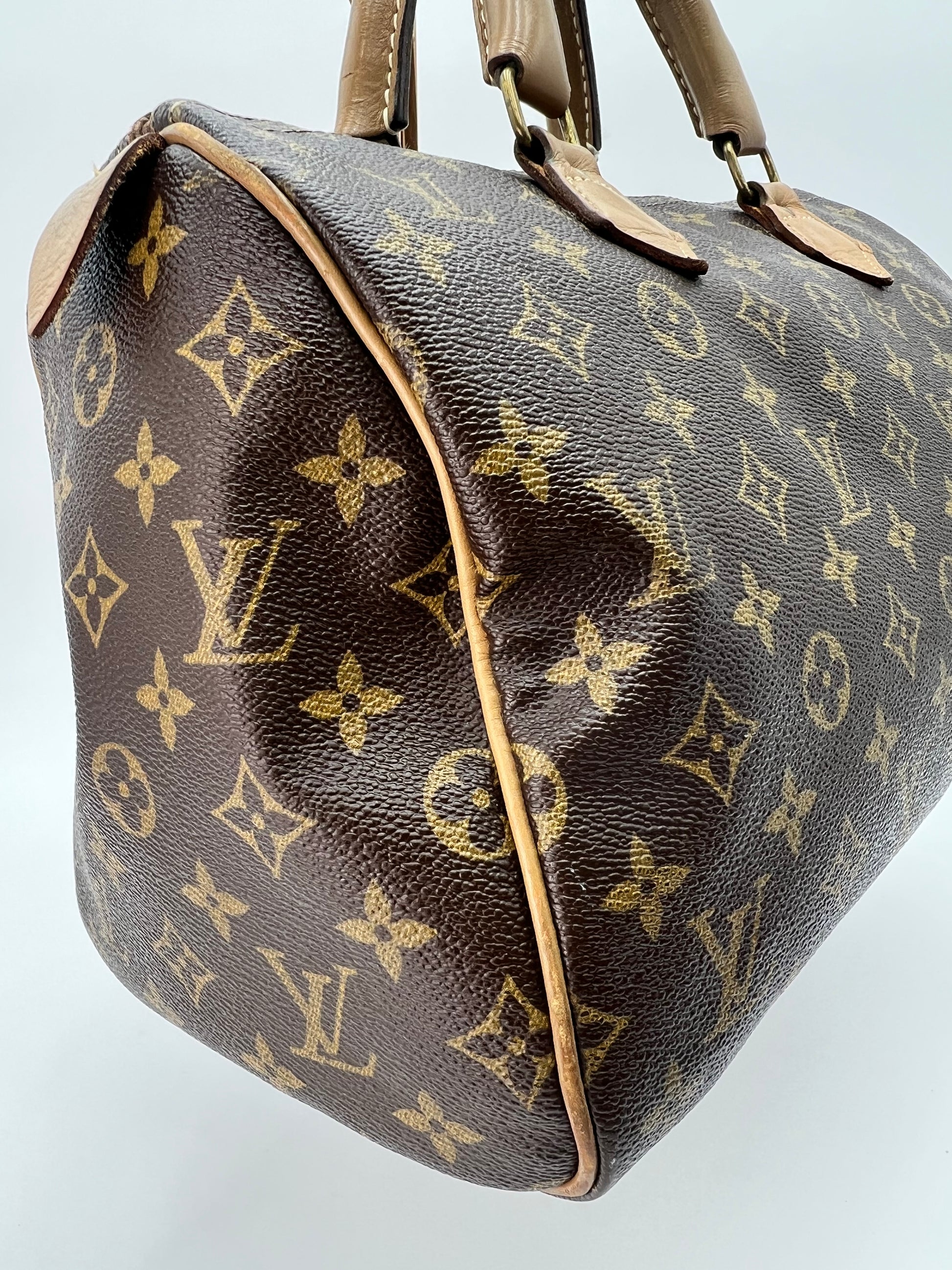 One of our favorite vintage Louis Vuitton handbags here at Vine Vintage! The speedy 30 is the perfect size and a classic silhouette. Staining to the interior is easily remedied by adding a purse insert that will help the bag hold its shape and give you a way to stay organized. Moderate wear throughout, however all the leather and chaps are structurally sound, the zipper runs smoothly and the lock functions as intended. Please review all photos carefully.
