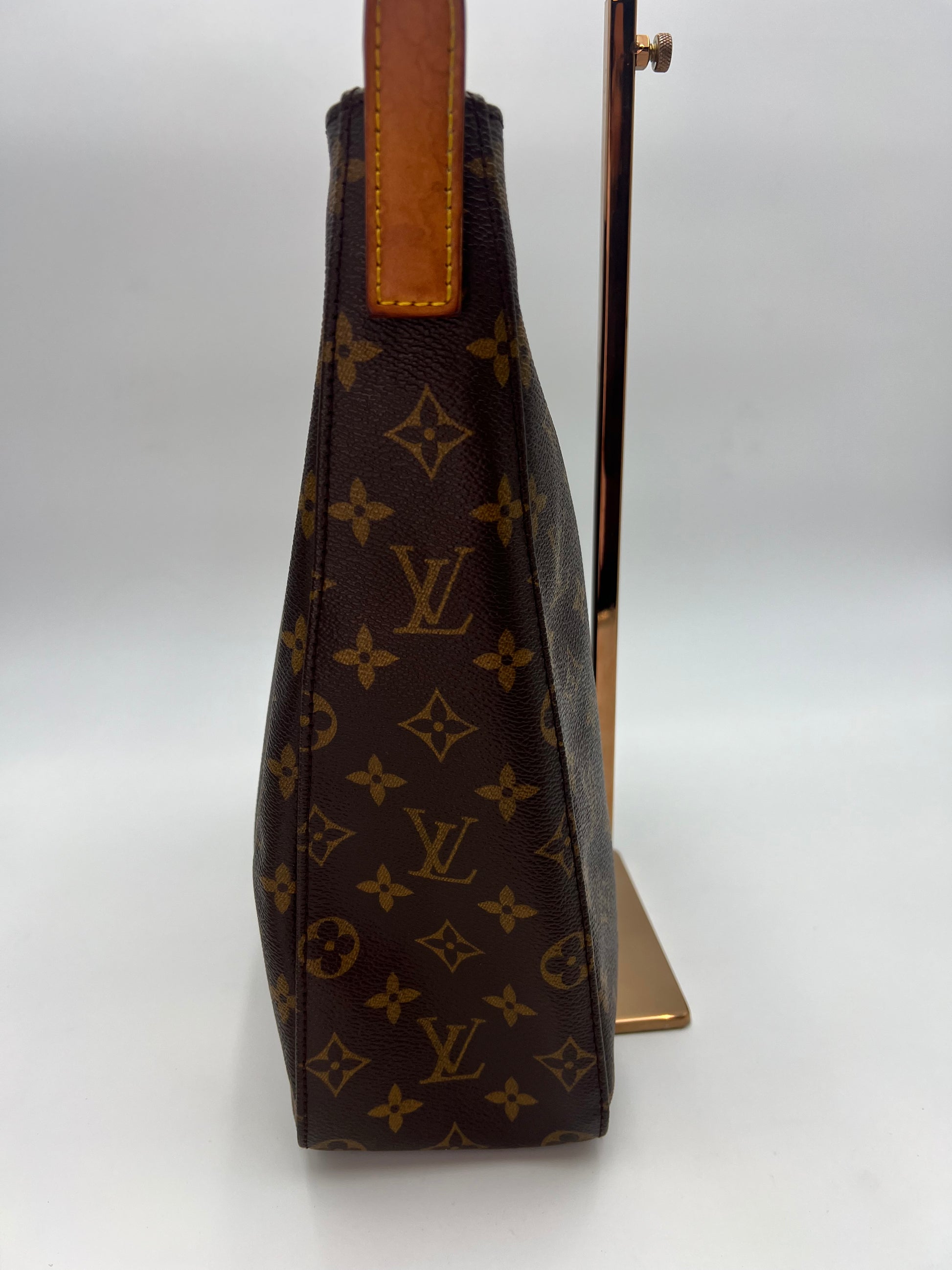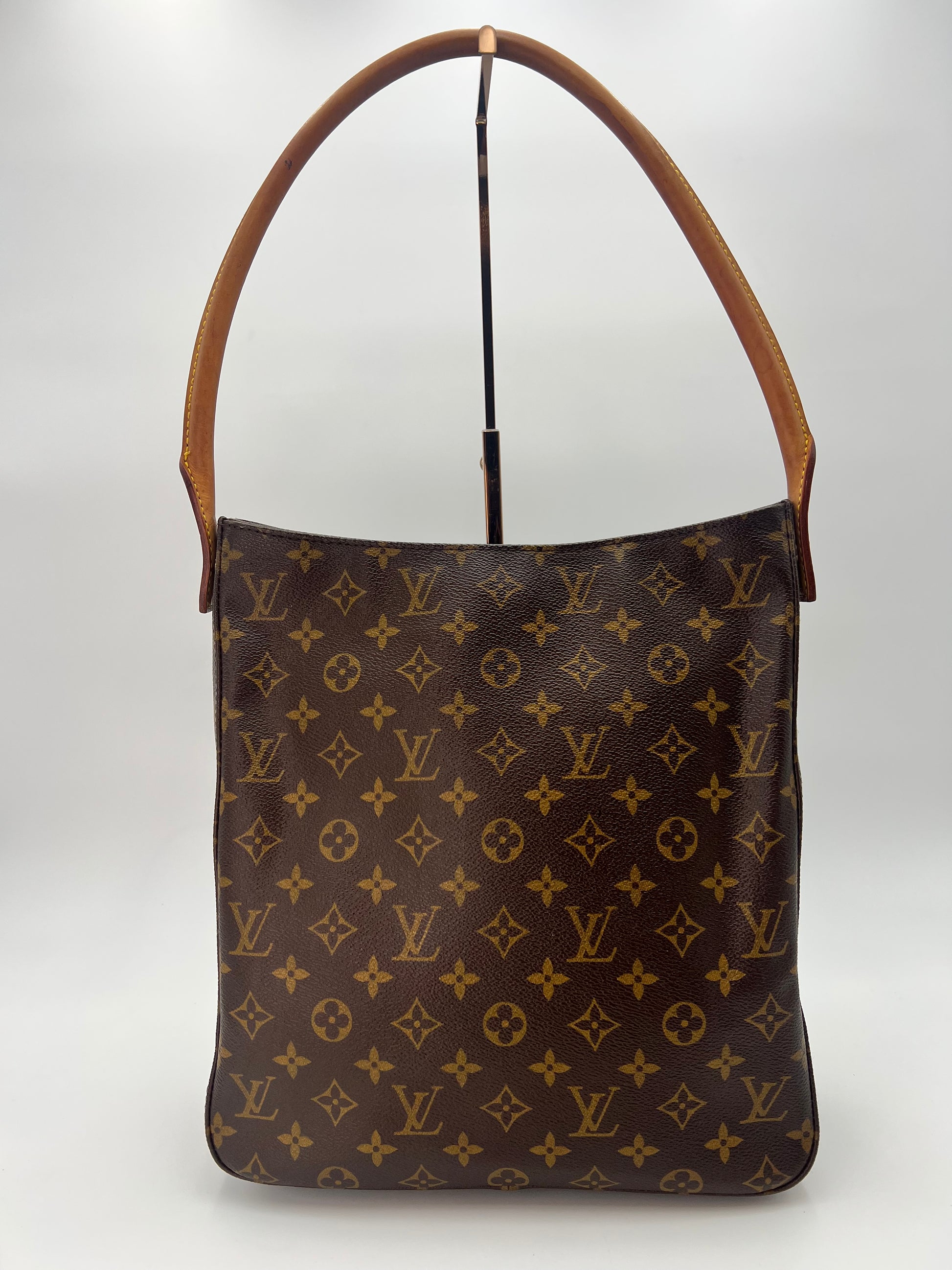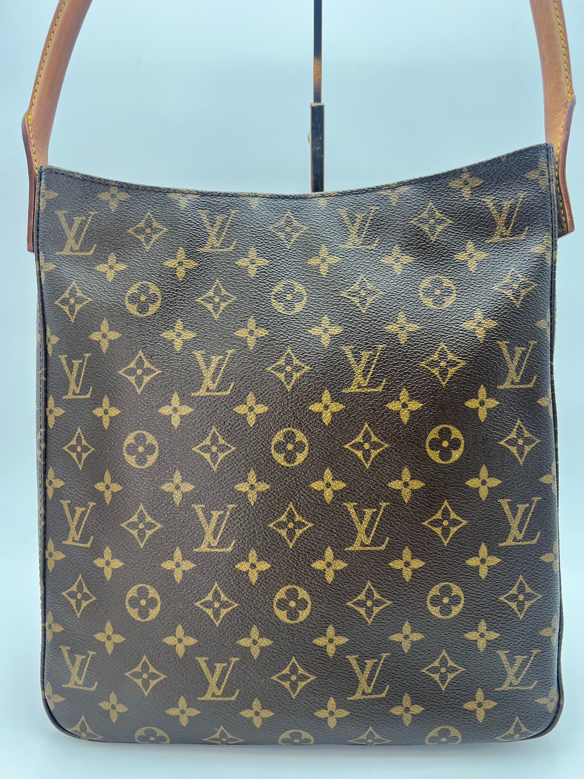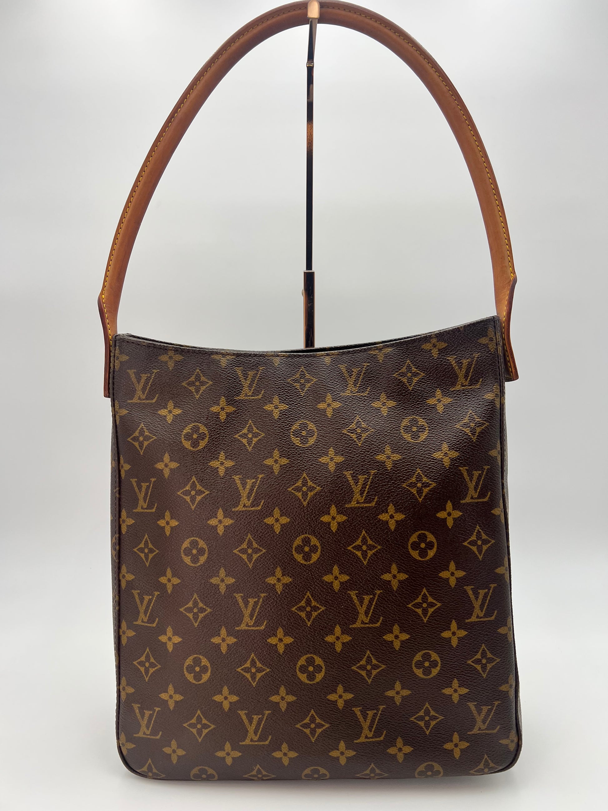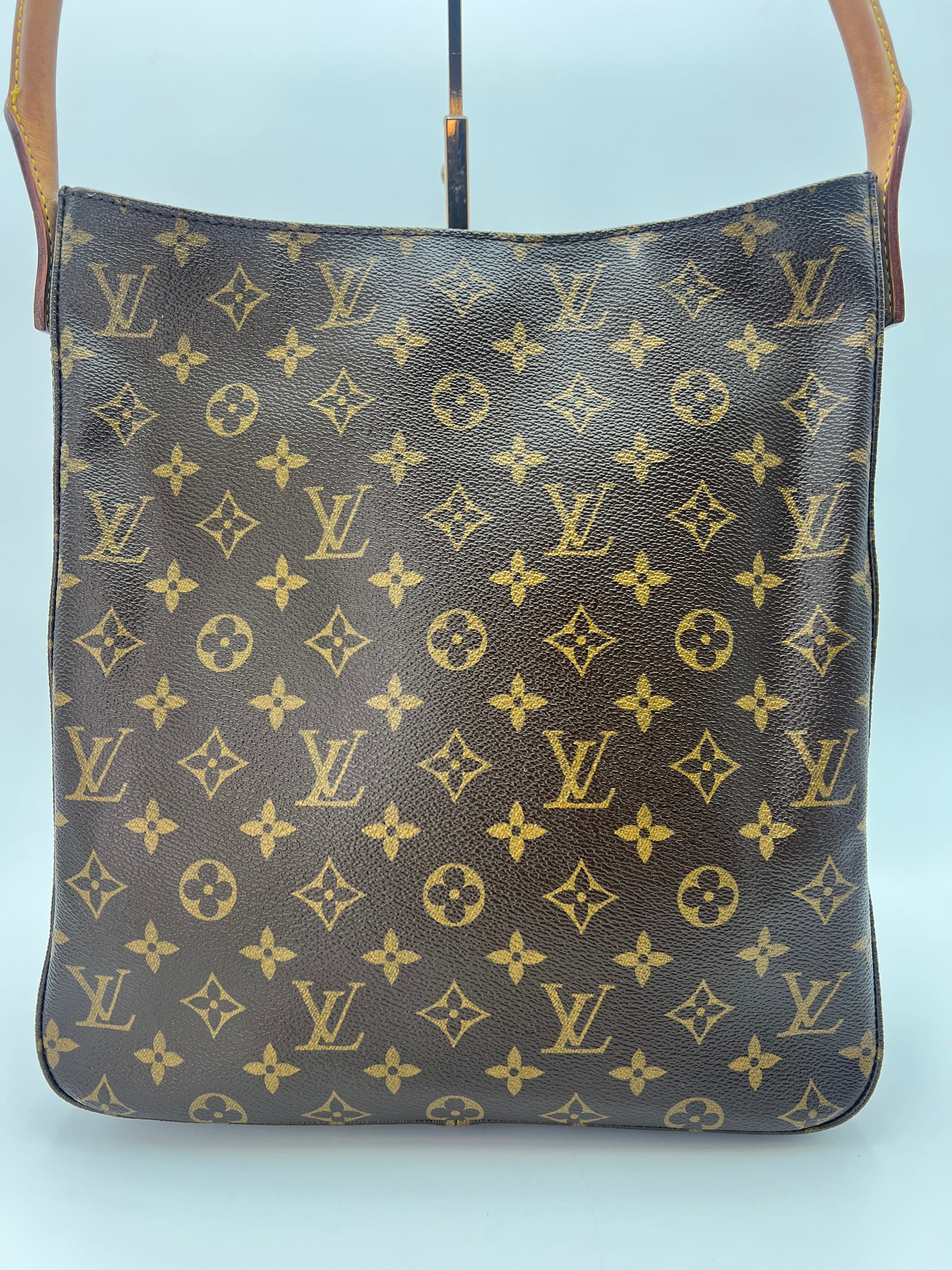 The looping GM is the largest of the looping styles. This stunning one strap piece is easy and effortless to carry on your shoulder. When not in use, the looping handle lays flat against the bag. Vibrant exterior canvas, leather is hydrated and free of cracks. The interior shows light stains and signs of use. The zipper runs smoothly and all pockets are clean and functional. Please review all photos carefully.