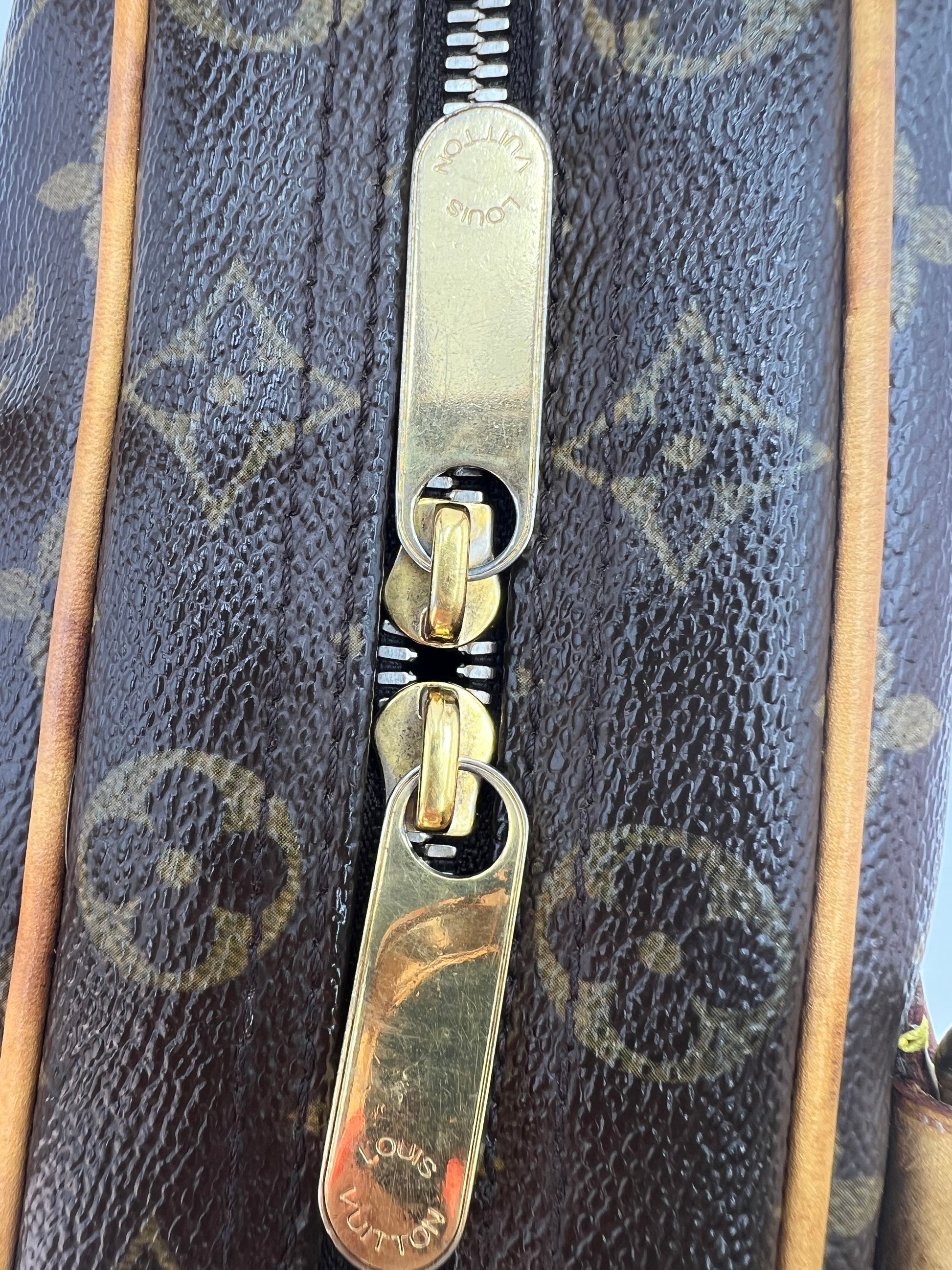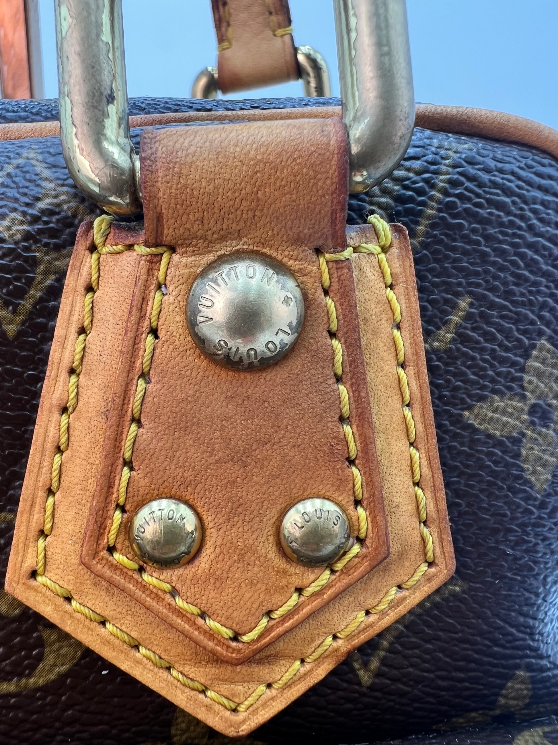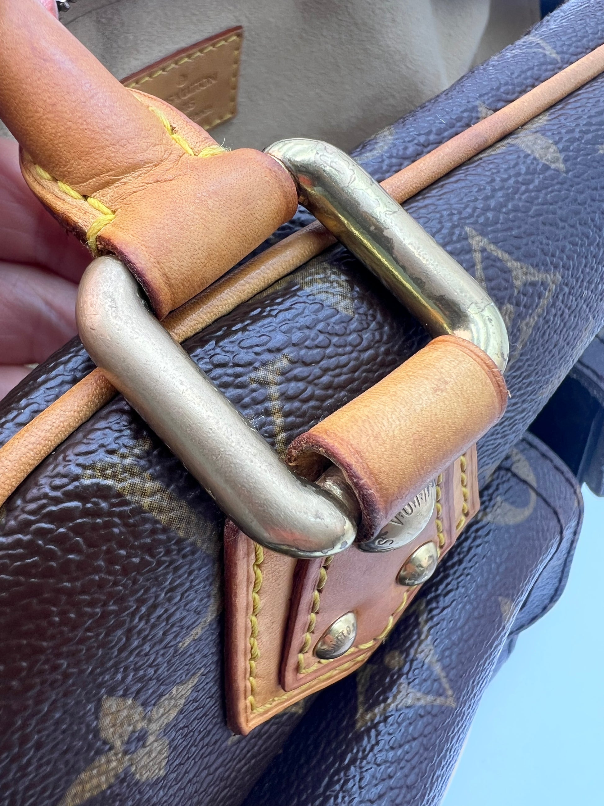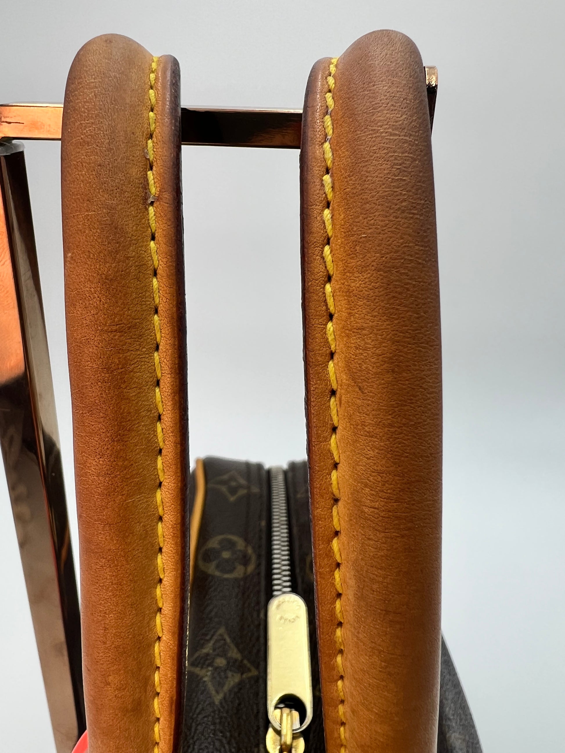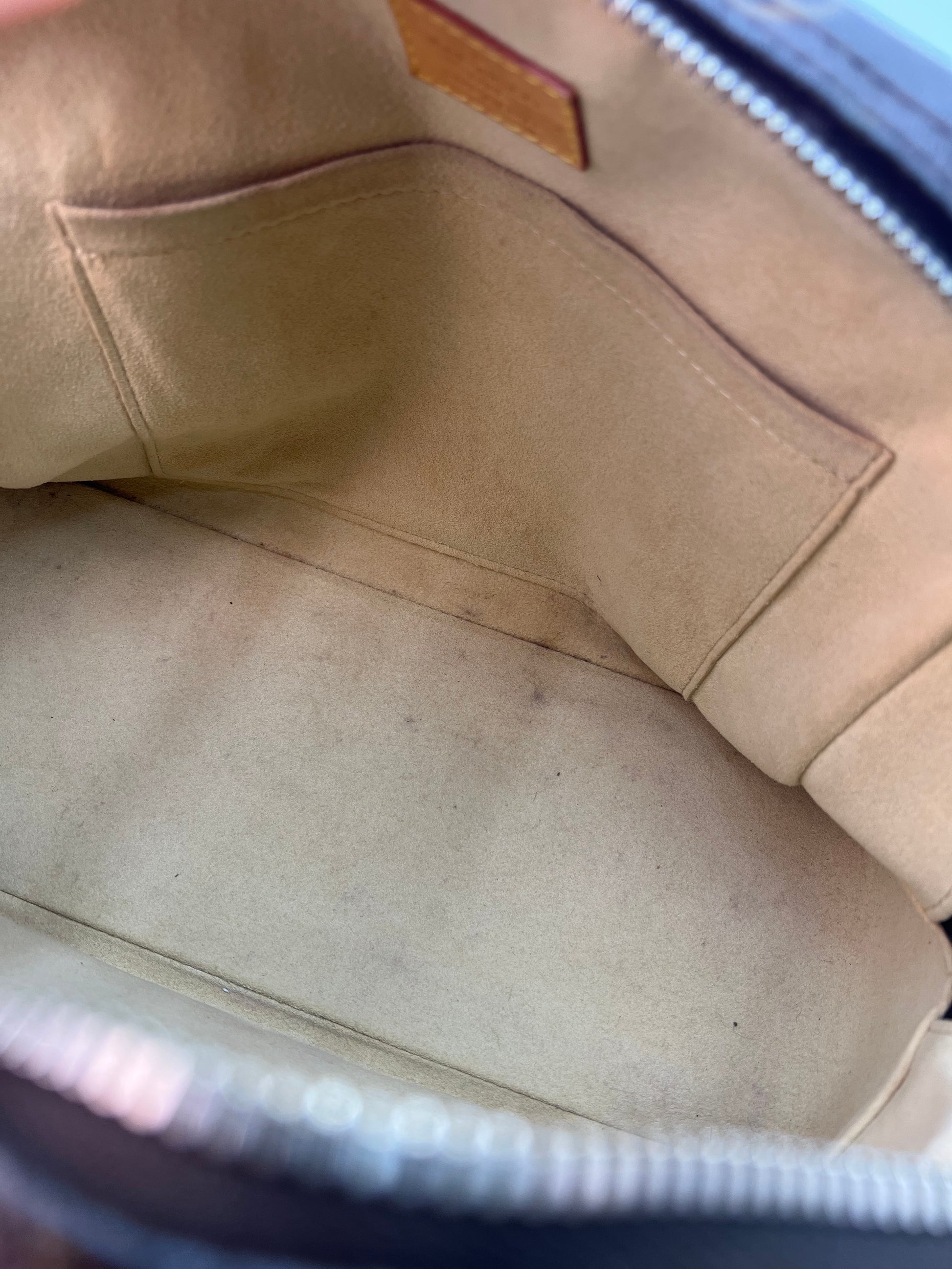 Leather is well hydrated and there are no cracks on the handles. There is exposed piping on the corners. The interior is clean. The exterior canvas is clean and bright. Overall the bag is in very good condition.