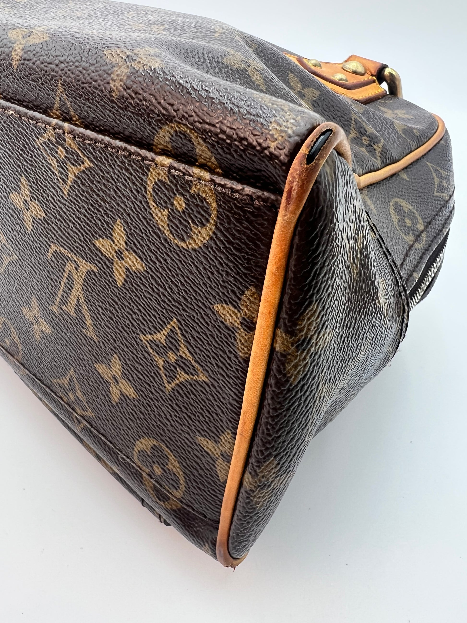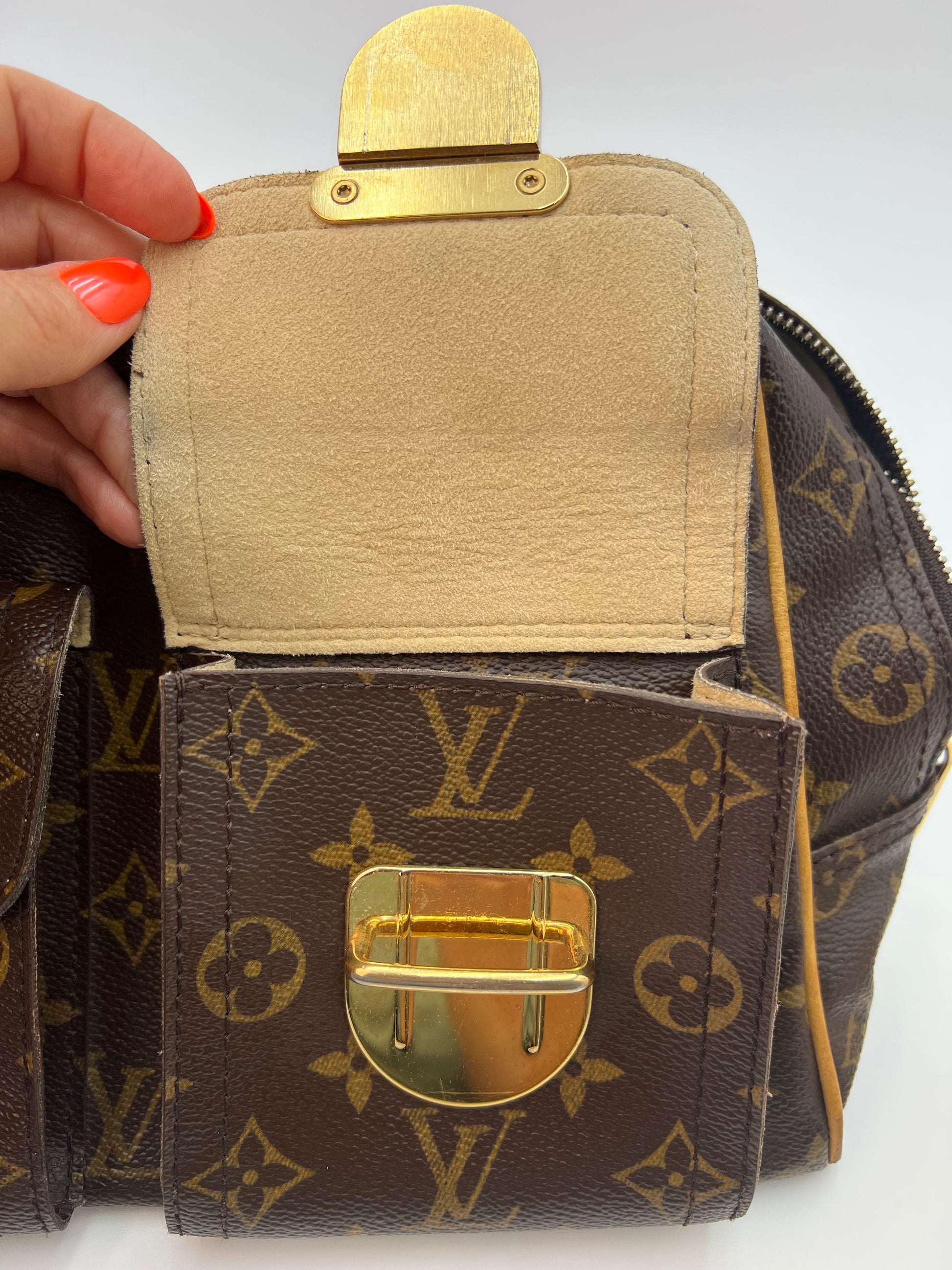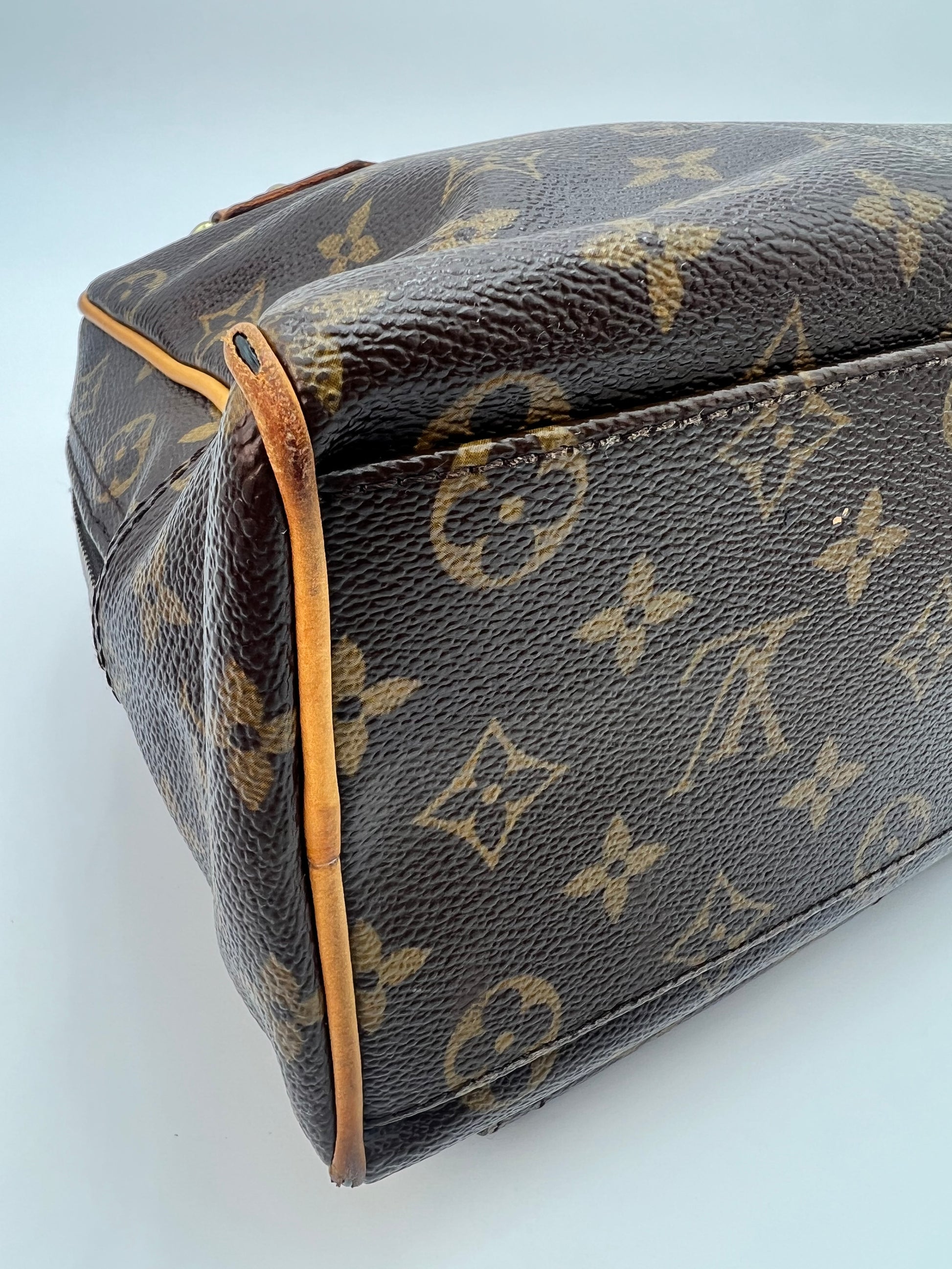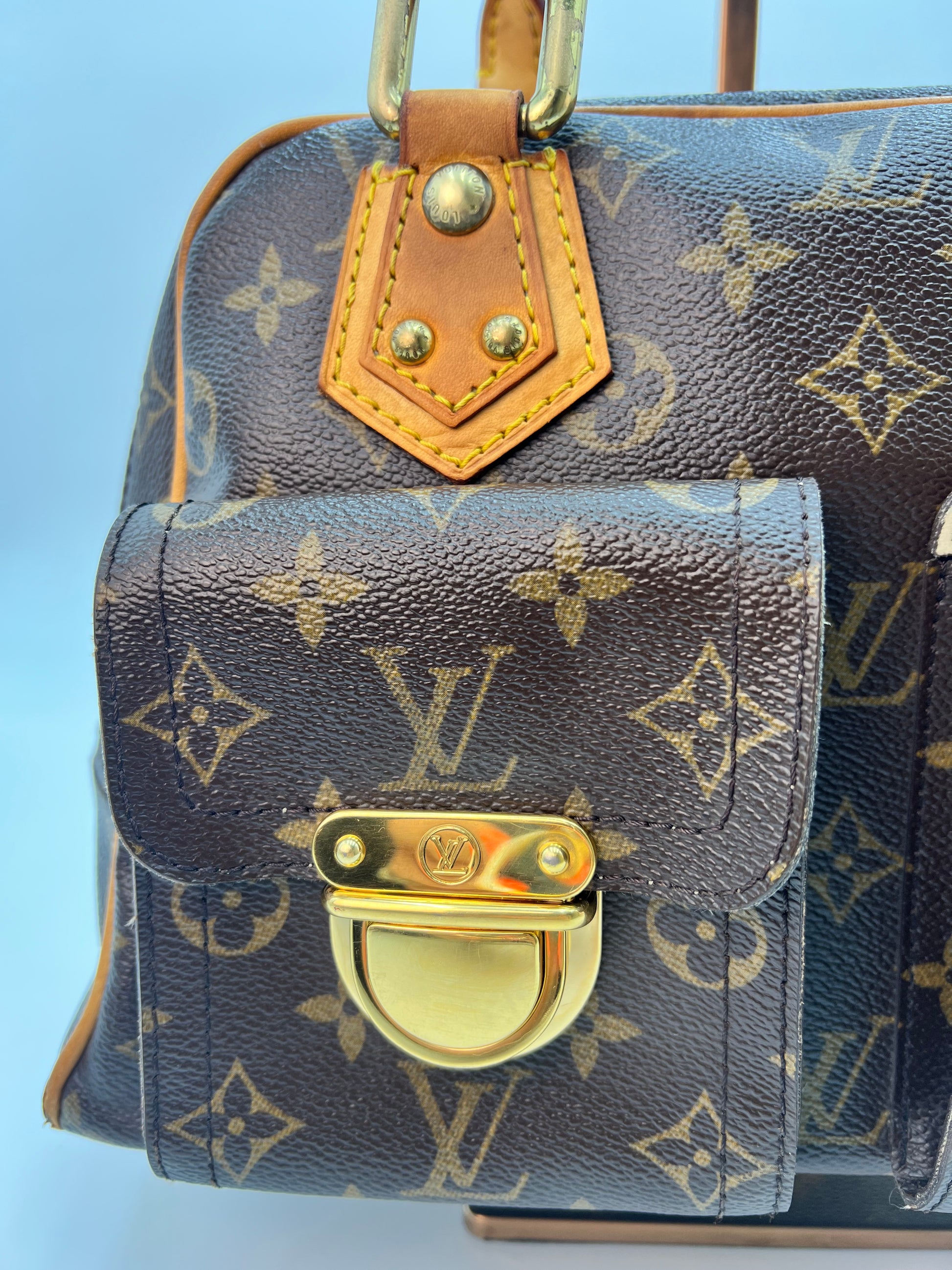 Leather is well hydrated and there are no cracks on the handles. There is exposed piping on the corners. The interior is clean. The exterior canvas is clean and bright. Overall the bag is in very good condition.