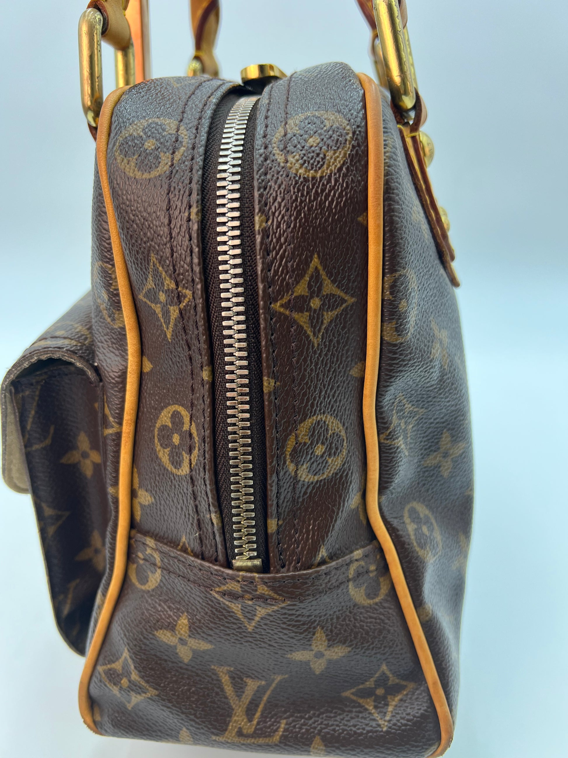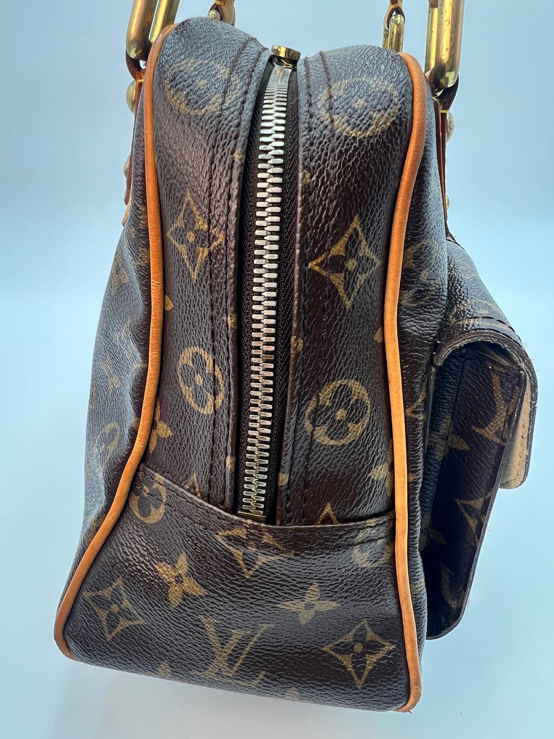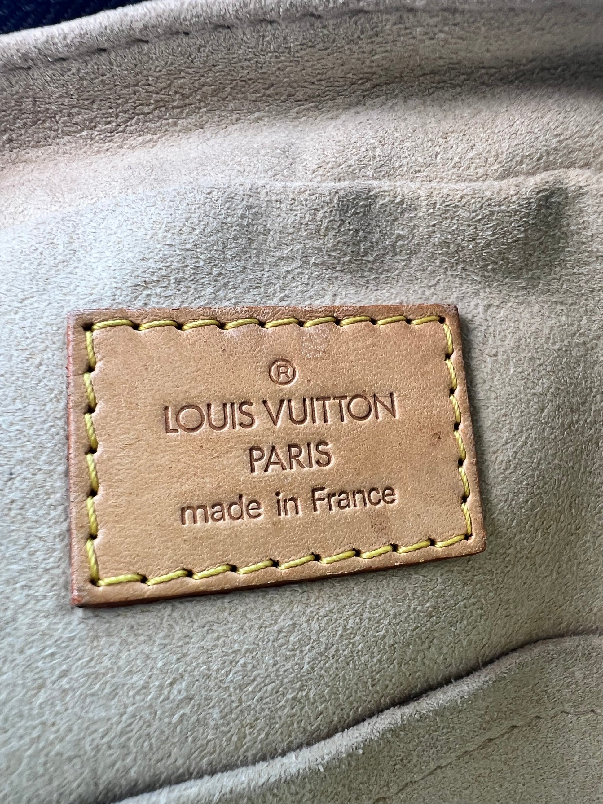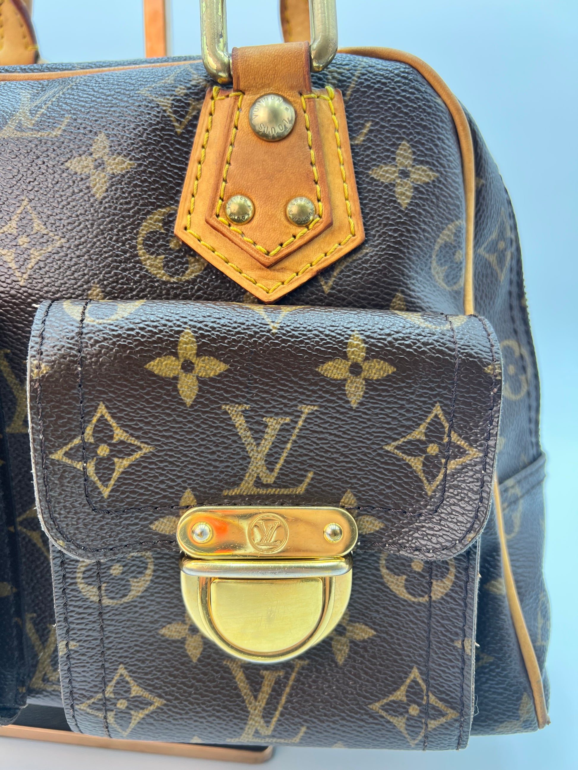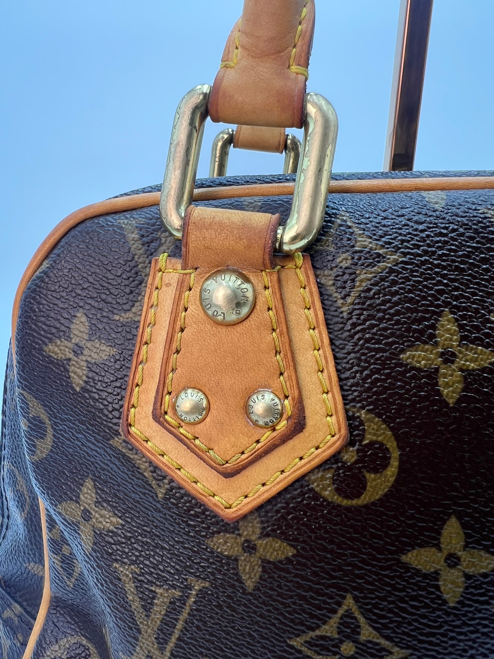 Leather is well hydrated and there are no cracks on the handles. There is exposed piping on the corners. The interior is clean. The exterior canvas is clean and bright. Overall the bag is in very good condition.