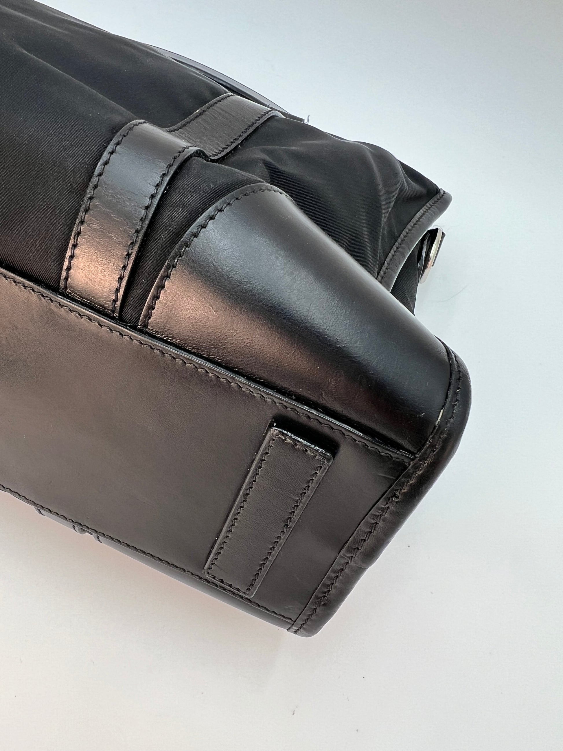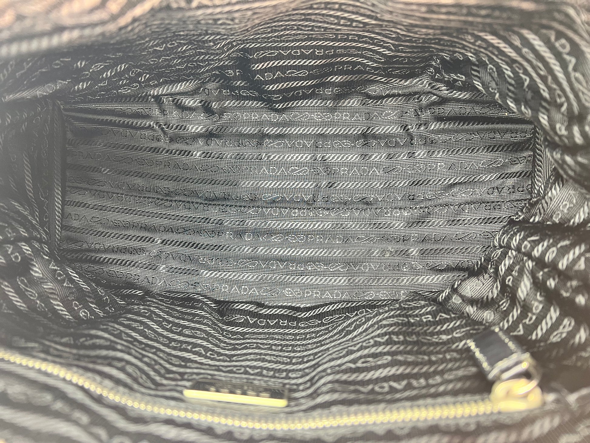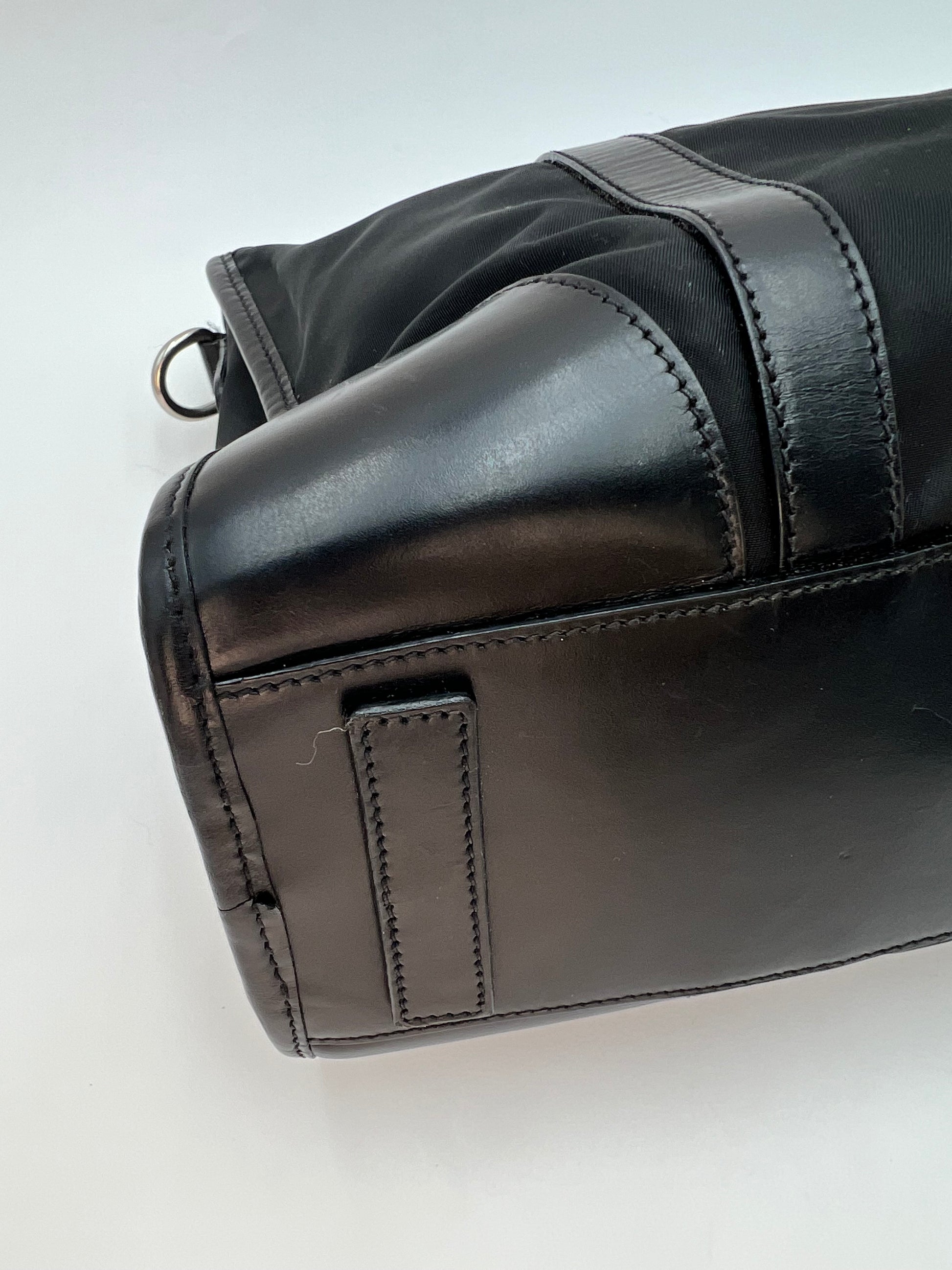 Classic black nylon and leather Prada handbag. Can be worn as a crossbody or used as a satchel. Scuffs along the leather trim along the top of the bag. Light wear throughout. Zipper runs smoothly and all pockets and interior lining are clean and functional. Comes with a nylon crossbody strap (not original to the piece). Please review all photos carefully.