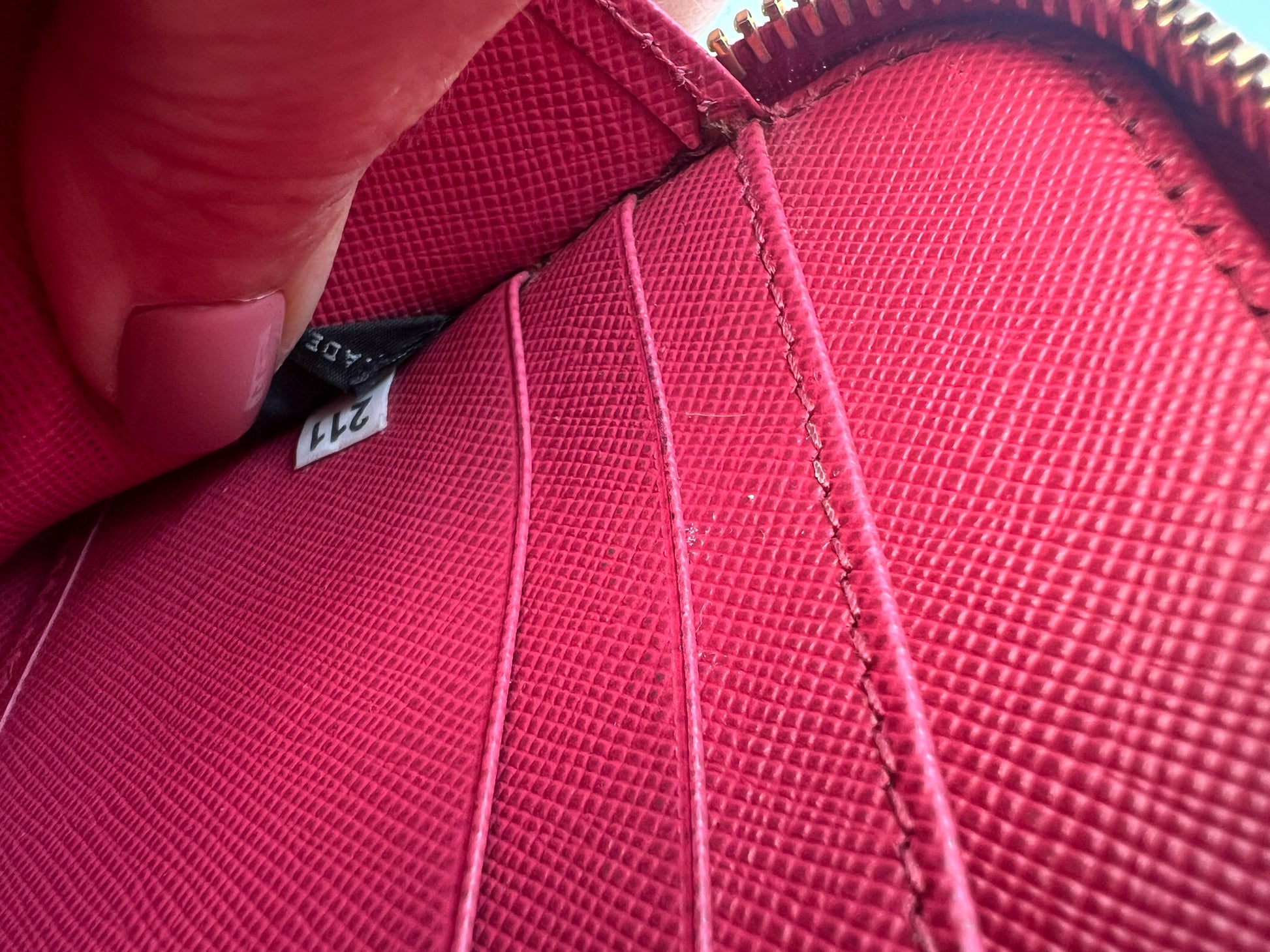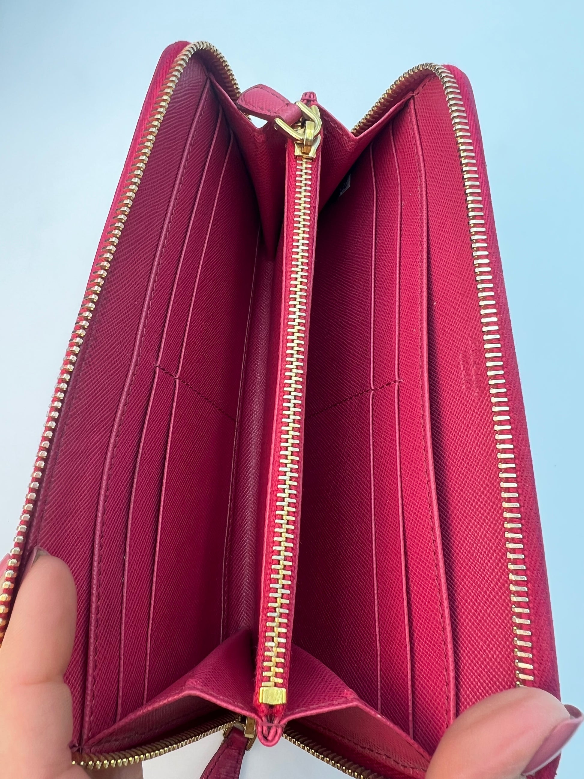Beautiful pink Prada wallet! Light wear to the fabric alongside the zipper and rubbing on the metal Prada logo. Interior is perfect and zipper runs smooth. Ask about adding a wristlet strap!